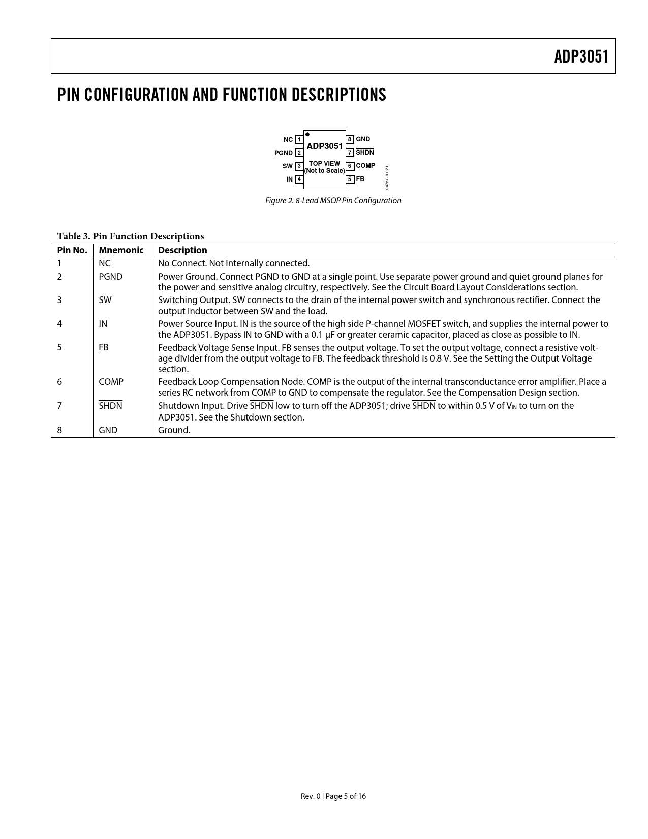 link to page 13 link to page 11 link to page 12 link to page 10 ADP3051PIN CONFIGURATION AND FUNCTION DESCRIPTIONSNC 18 GNDADP3051PGND 27 SHDNTOP VIEWSW 36 COMP(Not to Scale)IN 45 FB 04768-0-021 Figure 2. 8-Lead MSOP Pin Configuration Table 3. Pin Function Descriptions Pin No.MnemonicDescription 1 NC No Connect. Not internally connected. 2 PGND Power Ground. Connect PGND to GND at a single point. Use separate power ground and quiet ground planes for the power and sensitive analog circuitry, respectively. See the Circuit Board Layout Considerations section. 3 SW Switching Output. SW connects to the drain of the internal power switch and synchronous rectifier. Connect the output inductor between SW and the load. 4 IN Power Source Input. IN is the source of the high side P-channel MOSFET switch, and supplies the internal power to the ADP3051. Bypass IN to GND with a 0.1 µF or greater ceramic capacitor, placed as close as possible to IN. 5 FB Feedback Voltage Sense Input. FB senses the output voltage. To set the output voltage, connect a resistive volt- age divider from the output voltage to FB. The feedback threshold is 0.8 V. See the Setting the Output Voltage section. 6 COMP Feedback Loop Compensation Node. COMP is the output of the internal transconductance error amplifier. Place a series RC network from COMP to GND to compensate the regulator. See the Compensation Design section. 7 SHDN Shutdown Input. Drive SHDN low to turn off the ADP3051; drive SHDN to within 0.5 V of VIN to turn on the ADP3051. See the Shutdown section. 8 GND Ground. Rev. 0 | Page 5 of 16 Document Outline FEATURES APPLICATIONS GENERAL DESCRIP TYPICAL APPLICATION CIRCUIT TABLE OF CONTENTS SPECIFICATIONS ABSOLUTE MAXIMUM RATINGS ESD CAUTION PIN CONFIGURATION AND FUNCTION DESCRIPTIONS TYPICAL PERFORMANCE CHARACTERISTICS THEORY OF OPERATION PWM CONTROL MODE TRI-MODE OPERATION 100% DUTY CYCLE OPERATION SHUTDOWN UNDERVOLTAGE LOCKOUT (UVLO) SHORT-CIRCUIT PROTECTION AND RECOVERY APPLICATIONS RECOMMENDED COMPONENTS DESIGN PROCEDURE Setting the Output Voltage Inductor Selection OUTPUT CAPACITOR SELECTION Input Capacitor Selection Compensation Design CIRCUIT BOARD LAYOUT CONSIDERATIONS OUTLINE DIMENSIONS ORDERING GUIDE