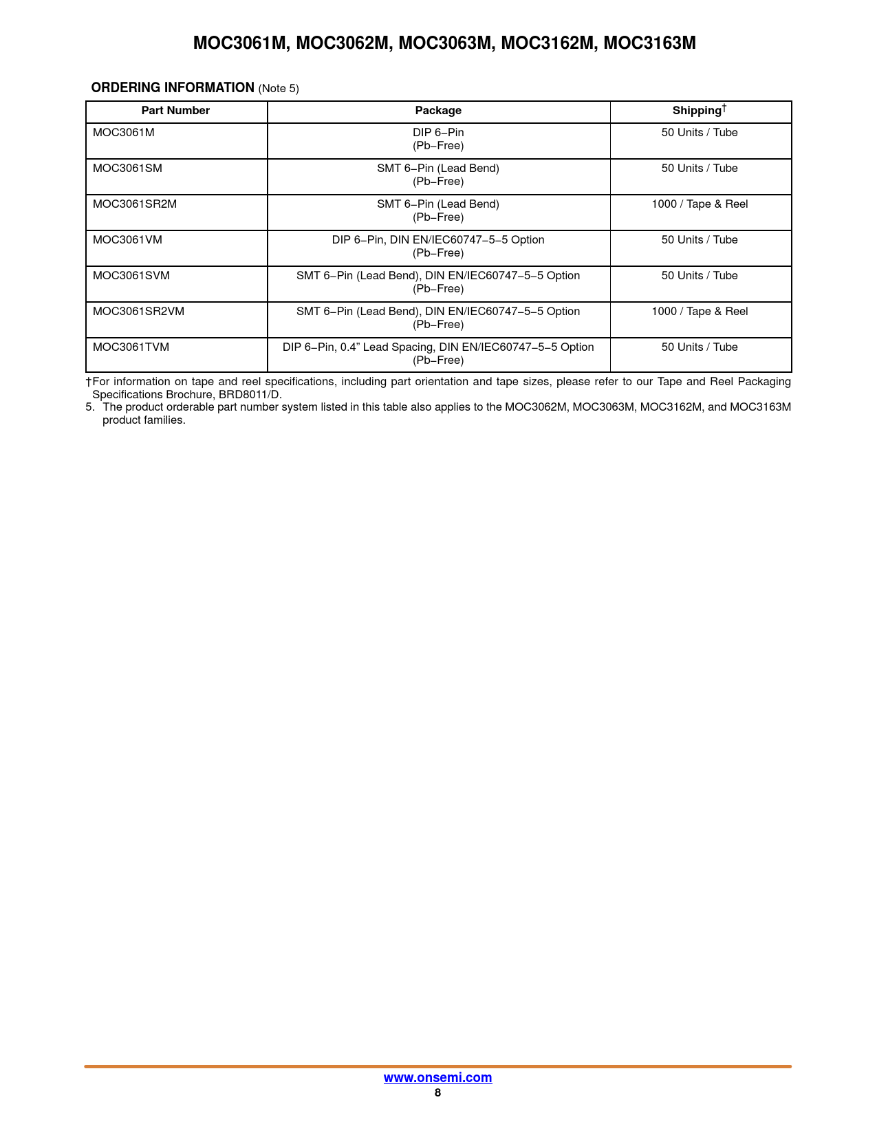 MOC3061M, MOC3062M, MOC3063M, MOC3162M, MOC3163M. ORDERING INFORMATION. Part Number. Package. Shipping. www.onsemi.com