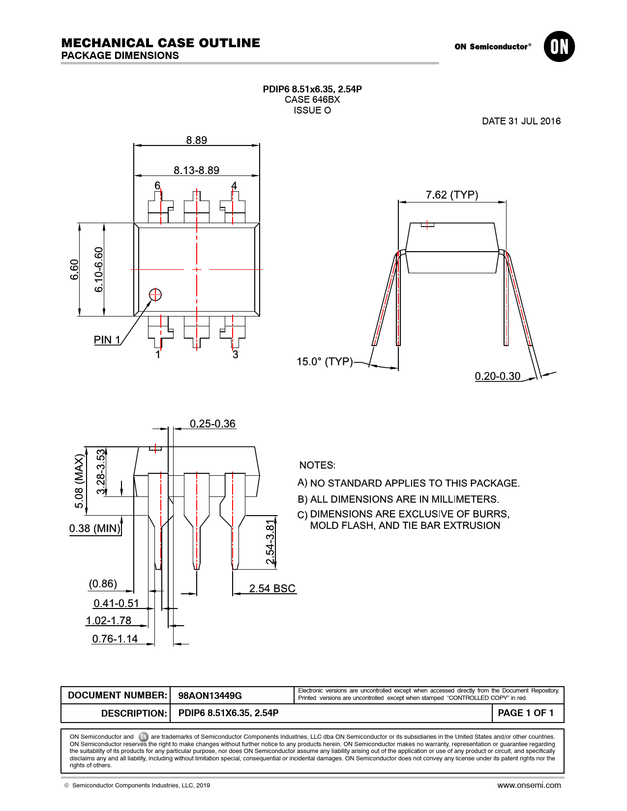 PACKAGE DIMENSIONS. PDIP6 8.51x6.35, 2.54P. DOCUMENT NUMBER: 98AON13449G. DESCRIPTION:. PDIP6 8.51X6.35, 2.54P. PAGE 1 OF 1