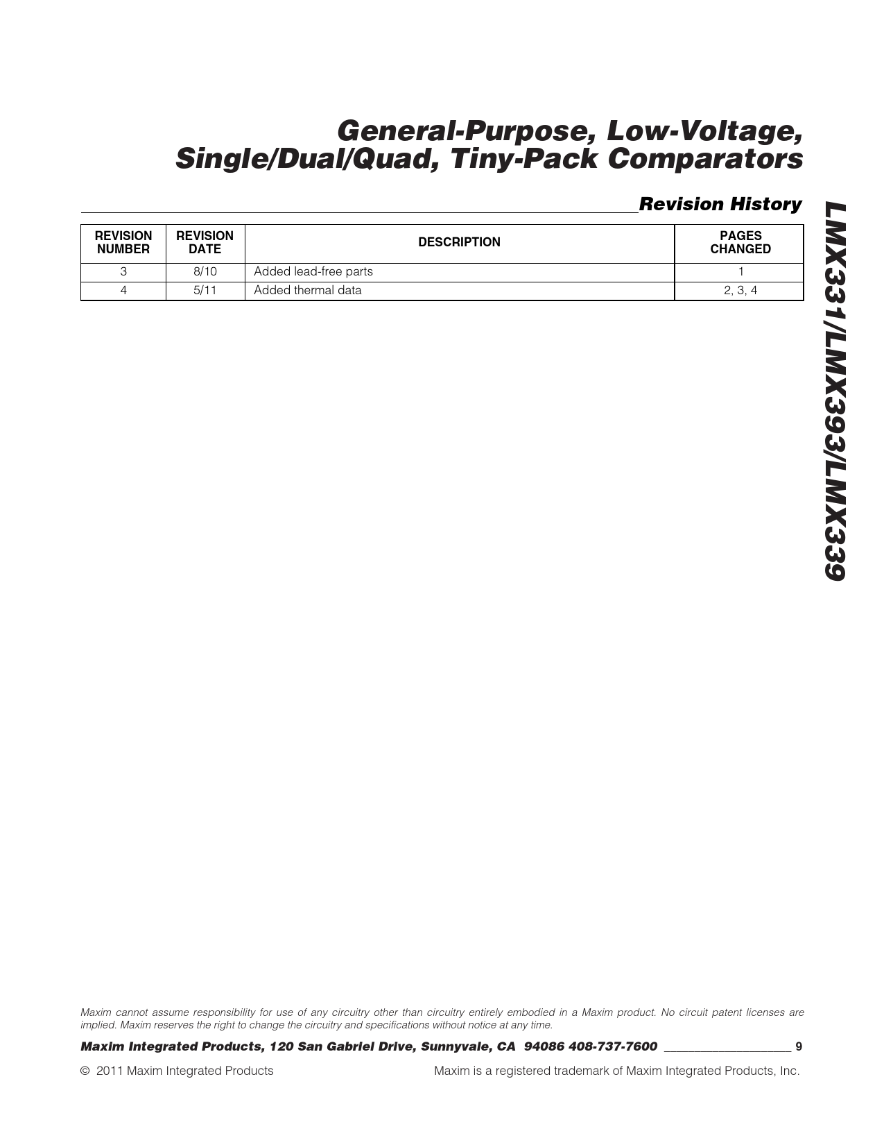 General-Purpose, Low-Voltage,. Single/Dual/Quad, Tiny-Pack Comparators. LMX331/LMX393/LMX339. Revision History. REVISION. PAGES
