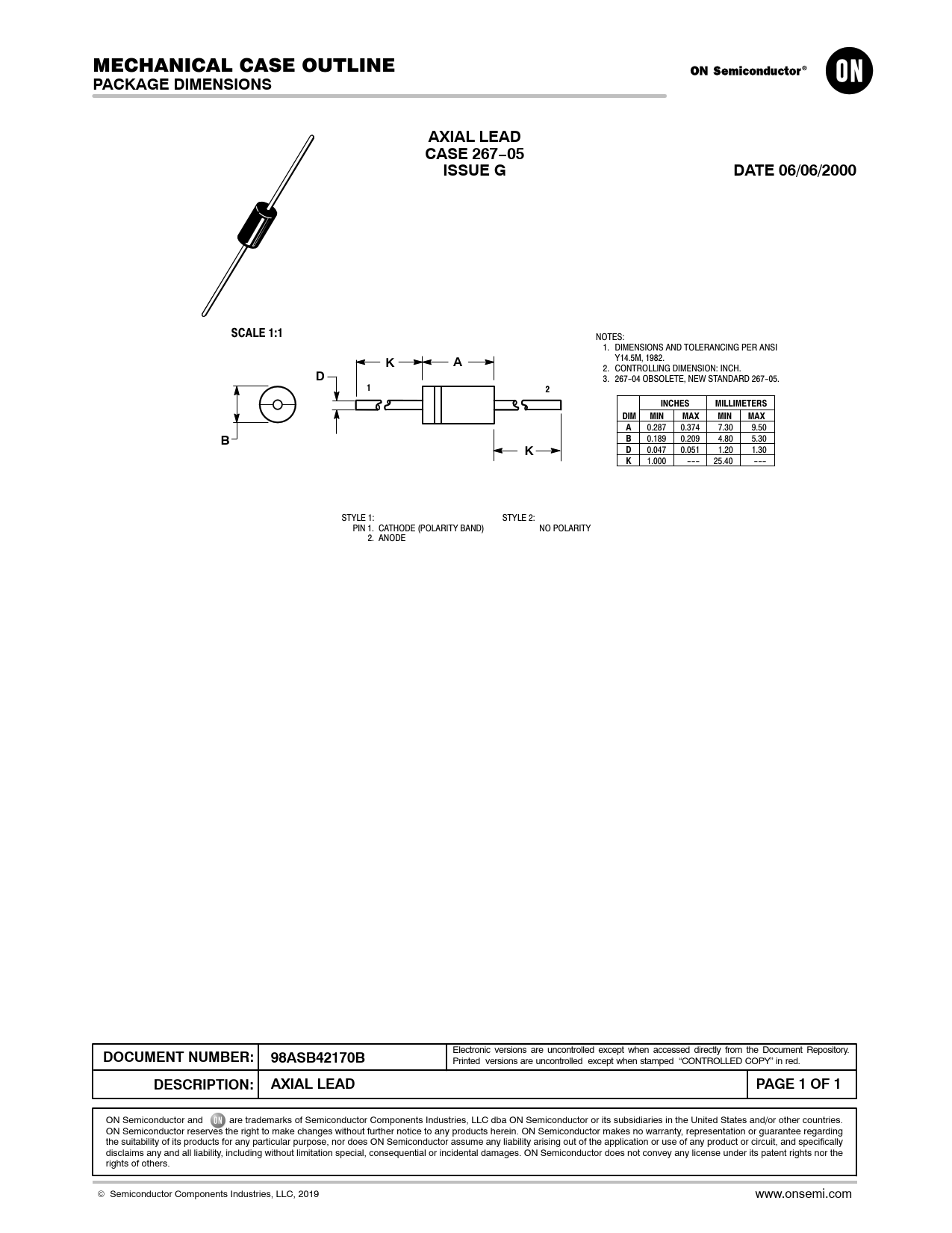 PACKAGE DIMENSIONS. AXIAL LEAD. CASE 267−05. ISSUE G. DATE 06/06/2000. SCALE 1:1. INCHES. MILLIMETERS. DIM. MIN. MAX