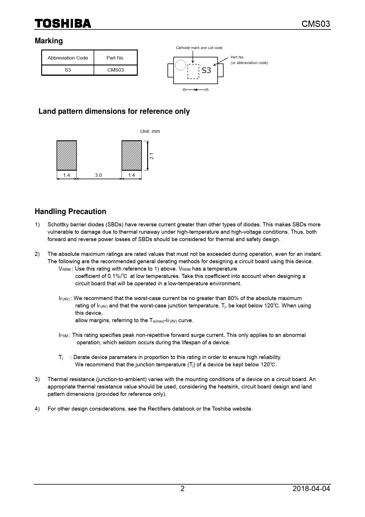 CMS03 Marking Abbreviation Code Part No. S3 CMS03 Land pattern dimensions for reference only Unit: mm 1 2. 1.4 3.0 1.4 Handling Precaution 1) Schottky barrier diodes (SBDs) have reverse current greater than other types of diodes. This makes SBDs more vulnerable to damage due to thermal runaway under high-temperature and high-voltage conditions. Thus, both forward and reverse power losses of SBDs should be considered for thermal and safety design. 2) The absolute maximum ratings are rated values that must not be exceeded during operation, even for an instant. The following are the recommended general derating methods for designing a circuit board using this device. VRRM : Use this rating with reference to 1) above. VRRM has a temperature coefficient of 0.1%/℃ at low temperatures. Take this coefficient into account when designing a circuit board that wil be operated in a low-temperature environment. IF(AV) : We recommend that the worst-case current be no greater than 80% of the absolute maximum rating of IF(AV) and that the worst-case junction temperature, Tj, be kept below 120℃. When using this device, allow margins, referring to the Ta(max)-IF(AV) curve. IFSM : This rating specifies peak non-repetitive forward surge current. This only applies to an abnormal operation, which seldom occurs during the lifespan of a device. Tj : Derate device parameters in proportion to this rating in order to ensure high reliability. We recommend that the junction temperature (Tj) of a device be kept below 120℃. 3) Thermal resistance (junction-to-ambient) varies with the mounting conditions of a device on a circuit board. An appropriate thermal resistance value should be used, considering the heatsink, circuit board design and land pattern dimensions (provided for reference only). 4) For other design considerations, see the Rectifiers databook or the Toshiba website. 2 2018-04-04