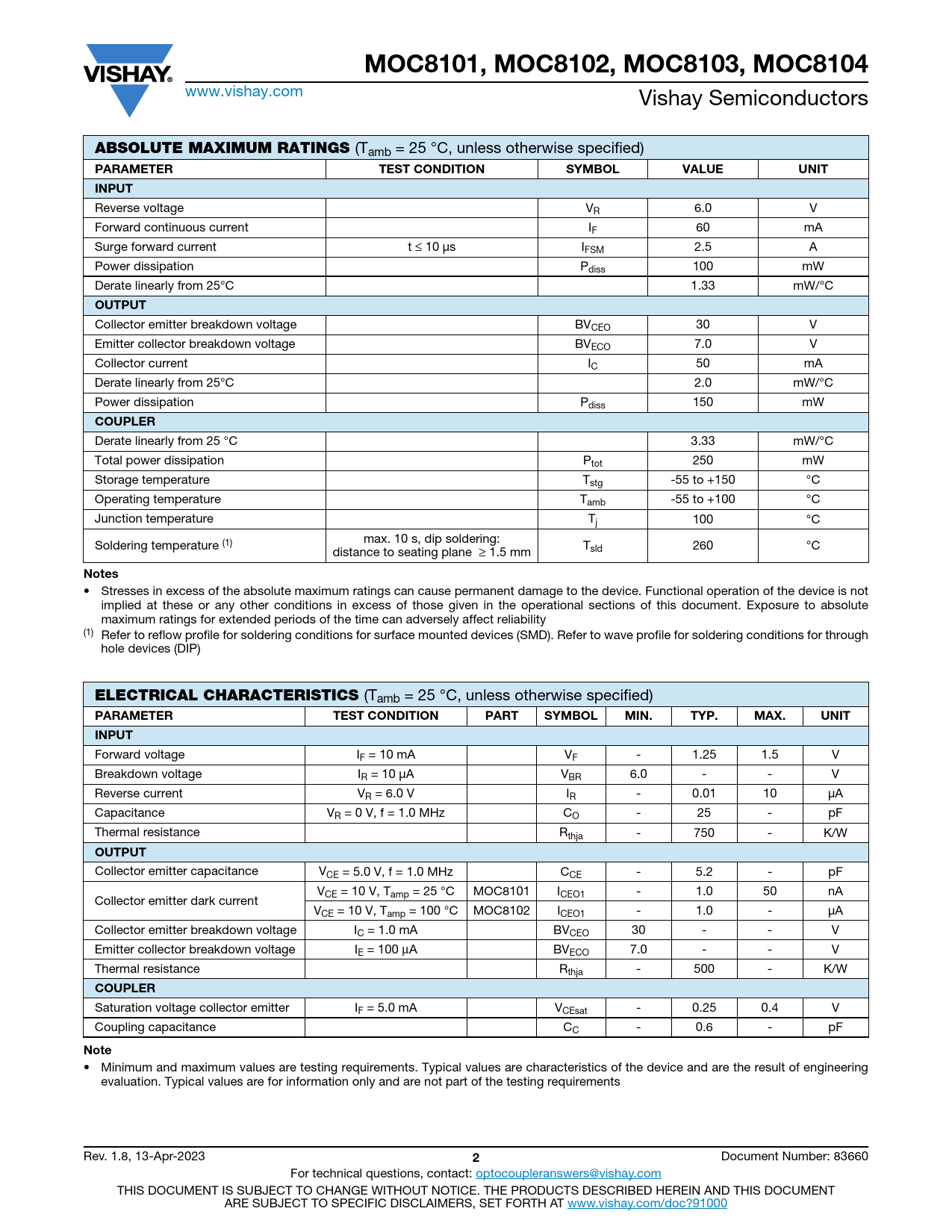 MOC8101, MOC8102, MOC8103, MOC8104 www.vishay.com Vishay Semiconductors ABSOLUTE MAXIMUM RATINGS (Tamb = 25 °C, unless otherwise specified) PARAMETERTEST CONDITIONSYMBOLVALUEUNITINPUT Reverse voltage VR 6.0 V Forward continuous current IF 60 mA Surge forward current t ≤ 10 μs IFSM 2.5 A Power dissipation Pdiss 100 mW Derate linearly from 25°C 1.33 mW/°C OUTPUT Collector emitter breakdown voltage BVCEO 30 V Emitter collector breakdown voltage BVECO 7.0 V Collector current IC 50 mA Derate linearly from 25°C 2.0 mW/°C Power dissipation Pdiss 150 mW COUPLER Derate linearly from 25 °C 3.33 mW/°C Total power dissipation Ptot 250 mW Storage temperature Tstg -55 to +150 °C Operating temperature Tamb -55 to +100 °C Junction temperature Tj 100 °C Soldering temperature (1) max. 10 s, dip soldering: T distance to seating plane ≥ 1.5 mm sld 260 °C Notes • Stresses in excess of the absolute maximum ratings can cause permanent damage to the device. Functional operation of the device is not implied at these or any other conditions in excess of those given in the operational sections of this document. Exposure to absolute maximum ratings for extended periods of the time can adversely affect reliability (1) Refer to reflow profile for soldering conditions for surface mounted devices (SMD). Refer to wave profile for soldering conditions for through hole devices (DIP) ELECTRICAL CHARACTERISTICS (Tamb = 25 °C, unless otherwise specified) PARAMETERTEST CONDITIONPARTSYMBOLMIN.TYP.MAX.UNITINPUT Forward voltage IF = 10 mA VF - 1.25 1.5 V Breakdown voltage IR = 10 μA VBR 6.0 - - V Reverse current VR = 6.0 V IR - 0.01 10 μA Capacitance VR = 0 V, f = 1.0 MHz CO - 25 - pF Thermal resistance Rthja - 750 - K/W OUTPUT Collector emitter capacitance VCE = 5.0 V, f = 1.0 MHz CCE - 5.2 - pF VCE = 10 V, Tamp = 25 °C MOC8101 ICEO1 - 1.0 50 nA Collector emitter dark current VCE = 10 V, Tamp = 100 °C MOC8102 ICEO1 - 1.0 - μA Collector emitter breakdown voltage IC = 1.0 mA BVCEO 30 - - V Emitter collector breakdown voltage IE = 100 μA BVECO 7.0 - - V Thermal resistance Rthja - 500 - K/W COUPLER Saturation voltage collector emitter IF = 5.0 mA VCEsat - 0.25 0.4 V Coupling capacitance CC - 0.6 - pF Note • Minimum and maximum values are testing requirements. Typical values are characteristics of the device and are the result of engineering evaluation. Typical values are for information only and are not part of the testing requirements Rev. 1.8, 13-Apr-2023 2 Document Number: 83660 For technical questions, contact: optocoupleranswers@vishay.com THIS DOCUMENT IS SUBJECT TO CHANGE WITHOUT NOTICE. THE PRODUCTS DESCRIBED HEREIN AND THIS DOCUMENT ARE SUBJECT TO SPECIFIC DISCLAIMERS, SET FORTH AT www.vishay.com/doc?91000