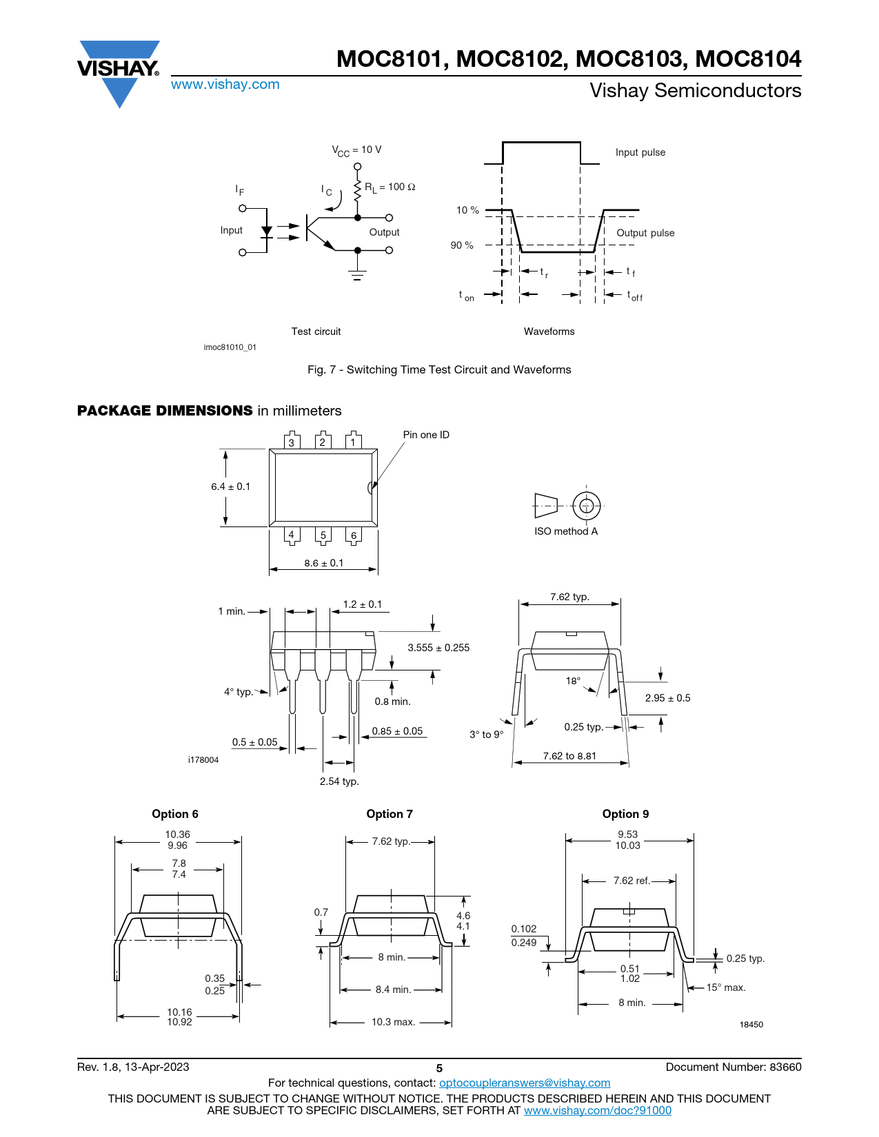 MOC8101, MOC8102, MOC8103, MOC8104 www.vishay.com Vishay Semiconductors V = 10 V CC Input pulse I I R F C L = 100 Ω 10 % Input Output Output pulse 90 % t t r f t on t of f Test circuit Waveforms imoc81010_01 Fig. 7 - Switching Time Test Circuit and Waveforms PACKAGE DIMENSIONS in millimeters Pin one ID 3 2 1 6.4 ± 0.1 4 5 6 ISO method A 8.6 ± 0.1 7.62 typ. 1.2 ± 0.1 1 min. 3.555 ± 0.255 18° 4° typ. 2.95 ± 0.5 0.8 min. 0.25 typ. 0.85 ± 0.05 3° to 9° 0.5 ± 0.05 i178004 7.62 to 8.81 2.54 typ. Option 6Option 7Option 9 10.36 9.53 9.96 7.62 typ. 10.03 7.8 7.4 7.62 ref. 0.7 4.6 4.1 0.102 0.249 8 min. 0.25 typ. 0.51 0.35 1.02 15° max. 0.25 8.4 min. 8 min. 10.16 10.92 10.3 max. 18450 Rev. 1.8, 13-Apr-2023 5 Document Number: 83660 For technical questions, contact: optocoupleranswers@vishay.com THIS DOCUMENT IS SUBJECT TO CHANGE WITHOUT NOTICE. THE PRODUCTS DESCRIBED HEREIN AND THIS DOCUMENT ARE SUBJECT TO SPECIFIC DISCLAIMERS, SET FORTH AT www.vishay.com/doc?91000