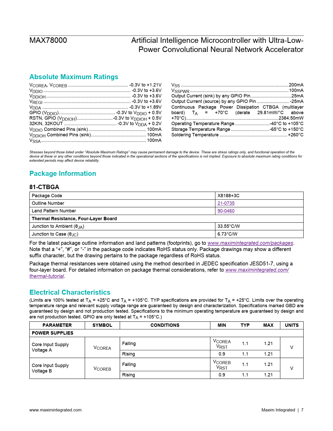 VCOREA Core Input Supply Falling 1.1 1.21 V VRST V Voltage A COREA Rising 0.9 1.1 1.21 VCOREB Core Input Supply Falling 1.1 1.21 V VRST V Voltage B COREB Rising 0.9 1.1 1.21 www.maximintegrated.com Maxim Integrated | 7 Document Outline General Description Applications Benefits and Features Simplified Block Diagram Absolute Maximum Ratings Package Information 81-CTBGA Electrical Characteristics Electrical Characteristics (continued) Electrical Characteristics—SPI Electrical Characteristics—SPI (continued) Electrical Characteristics—I2C Electrical Characteristics—I2C (continued) Electrical Characteristics—I2S Electrical Characteristics—I2S (continued) Electrical Characteristics—PCIF Electrical Characteristics—1-Wire Master Electrical Characteristics—1-Wire Master (continued) Pin Configuration 81 CTBGA Pin Description 81 CTBGA Detailed Description Arm Cortex-M4 with FPU Processor and RISC-V RV32 Processor Convolutional Neural Network Accelerator (CNN) Memory Internal Flash Memory Internal SRAM Comparators Dynamic Voltage Scaling (DVS) Controller Clocking Scheme General-Purpose I/O and Special Function Pins Parallel Camera Interface (PCIF) Analog-to-Digital Converter Single-Inductor Multiple-Output Switch-Mode Power Supply (SIMO SMPS) Power Management Power Management Unit ACTIVE Mode SLEEP Mode LOW POWER Mode (LPM) MICRO POWER Mode (μPM) STANDBY Mode BACKUP Mode POWER DOWN Mode (PDM) Wakeup Sources Real-Time Clock Programmable Timers 32-Bit Timer/Counter/PWM (TMR, LPTMR) Watchdog Timer (WDT) Pulse Train Engine (PT) Serial Peripherals I2C Interface (I2C) I2S Interface (I2S) Serial Peripheral Interface (SPI) UART (UART, LPUART) 1-Wire Master (OWM) Standard DMA Controller Security AES True Random Number Generator (TRNG) Non-Deterministic Random Bit Generator (NDRBG) CRC Module Bootloader Secure Boot Debug and Development Interface (SWD, JTAG) Applications Information Bypass Capacitors Ordering Information Revision History