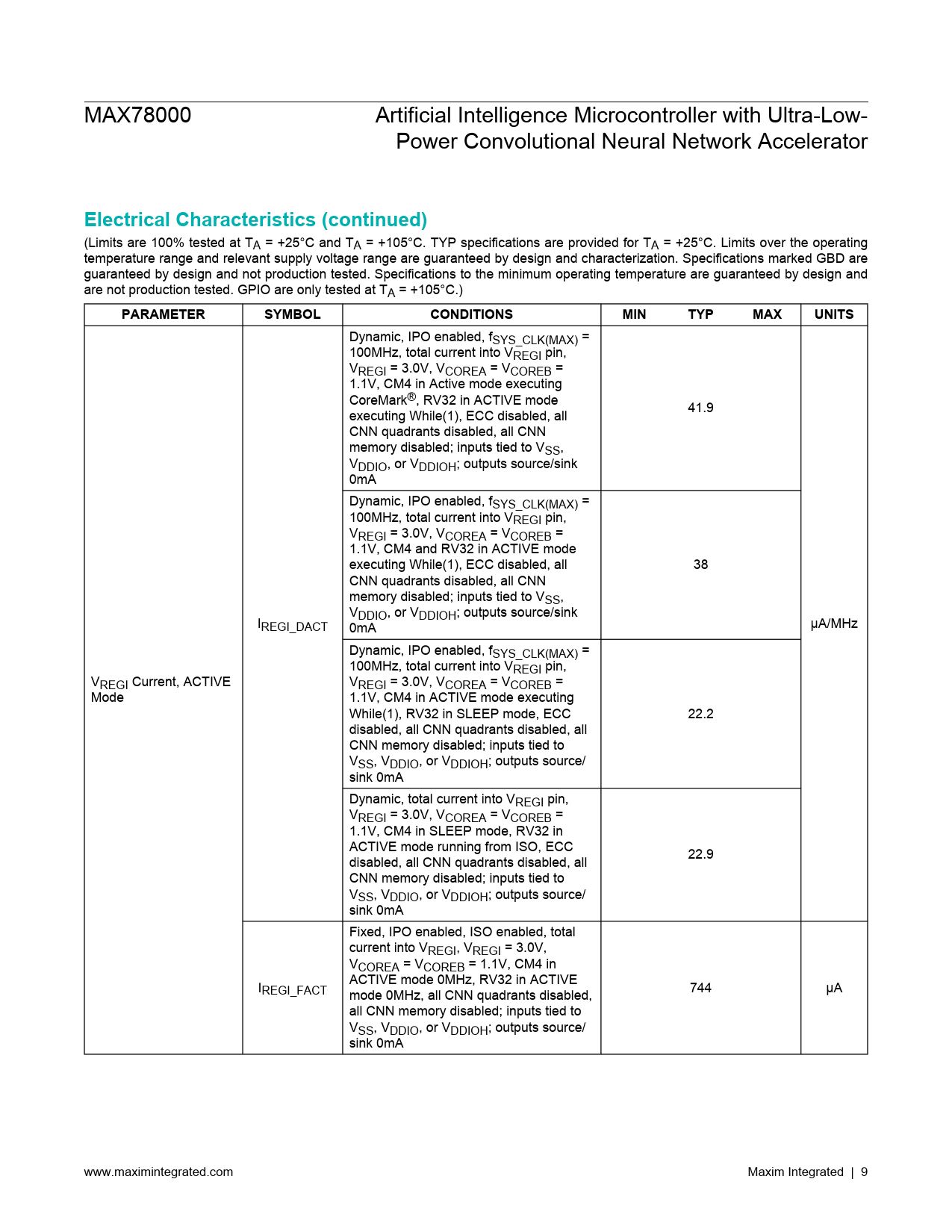 Dynamic, IPO enabled, fSYS_CLK(MAX) = 100MHz, total current into VREGI pin, VREGI = 3.0V, VCOREA = VCOREB = 1.1V, CM4 in Active mode executing CoreMark®, RV32 in ACTIVE mode 41.9 executing While(1), ECC disabled, all CNN quadrants disabled, all CNN memory disabled; inputs tied to VSS, VDDIO, or VDDIOH; outputs source/sink 0mA Dynamic, IPO enabled, fSYS_CLK(MAX) = 100MHz, total current into VREGI pin, VREGI = 3.0V, VCOREA = VCOREB = 1.1V, CM4 and RV32 in ACTIVE mode executing While(1), ECC disabled, all 38 CNN quadrants disabled, all CNN memory disabled; inputs tied to VSS, VDDIO, or VDDIOH; outputs source/sink IREGI_DACT μA/MHz 0mA Dynamic, IPO enabled, fSYS_CLK(MAX) = 100MHz, total current into VREGI pin, VREGI Current, ACTIVE VREGI = 3.0V, VCOREA = VCOREB = Mode 1.1V, CM4 in ACTIVE mode executing While(1), RV32 in SLEEP mode, ECC 22.2 disabled, all CNN quadrants disabled, all CNN memory disabled; inputs tied to VSS, VDDIO, or VDDIOH; outputs source/ sink 0mA Dynamic, total current into VREGI pin, VREGI = 3.0V, VCOREA = VCOREB = 1.1V, CM4 in SLEEP mode, RV32 in ACTIVE mode running from ISO, ECC 22.9 disabled, all CNN quadrants disabled, all CNN memory disabled; inputs tied to VSS, VDDIO, or VDDIOH; outputs source/ sink 0mA Fixed, IPO enabled, ISO enabled, total current into VREGI, VREGI = 3.0V, VCOREA = VCOREB = 1.1V, CM4 in ACTIVE mode 0MHz, RV32 in ACTIVE IREGI_FACT 744 μA mode 0MHz, all CNN quadrants disabled, all CNN memory disabled; inputs tied to VSS, VDDIO, or VDDIOH; outputs source/ sink 0mA www.maximintegrated.com Maxim Integrated | 9 Document Outline General Description Applications Benefits and Features Simplified Block Diagram Absolute Maximum Ratings Package Information 81-CTBGA Electrical Characteristics Electrical Characteristics (continued) Electrical Characteristics—SPI Electrical Characteristics—SPI (continued) Electrical Characteristics—I2C Electrical Characteristics—I2C (continued) Electrical Characteristics—I2S Electrical Characteristics—I2S (continued) Electrical Characteristics—PCIF Electrical Characteristics—1-Wire Master Electrical Characteristics—1-Wire Master (continued) Pin Configuration 81 CTBGA Pin Description 81 CTBGA Detailed Description Arm Cortex-M4 with FPU Processor and RISC-V RV32 Processor Convolutional Neural Network Accelerator (CNN) Memory Internal Flash Memory Internal SRAM Comparators Dynamic Voltage Scaling (DVS) Controller Clocking Scheme General-Purpose I/O and Special Function Pins Parallel Camera Interface (PCIF) Analog-to-Digital Converter Single-Inductor Multiple-Output Switch-Mode Power Supply (SIMO SMPS) Power Management Power Management Unit ACTIVE Mode SLEEP Mode LOW POWER Mode (LPM) MICRO POWER Mode (μPM) STANDBY Mode BACKUP Mode POWER DOWN Mode (PDM) Wakeup Sources Real-Time Clock Programmable Timers 32-Bit Timer/Counter/PWM (TMR, LPTMR) Watchdog Timer (WDT) Pulse Train Engine (PT) Serial Peripherals I2C Interface (I2C) I2S Interface (I2S) Serial Peripheral Interface (SPI) UART (UART, LPUART) 1-Wire Master (OWM) Standard DMA Controller Security AES True Random Number Generator (TRNG) Non-Deterministic Random Bit Generator (NDRBG) CRC Module Bootloader Secure Boot Debug and Development Interface (SWD, JTAG) Applications Information Bypass Capacitors Ordering Information Revision History