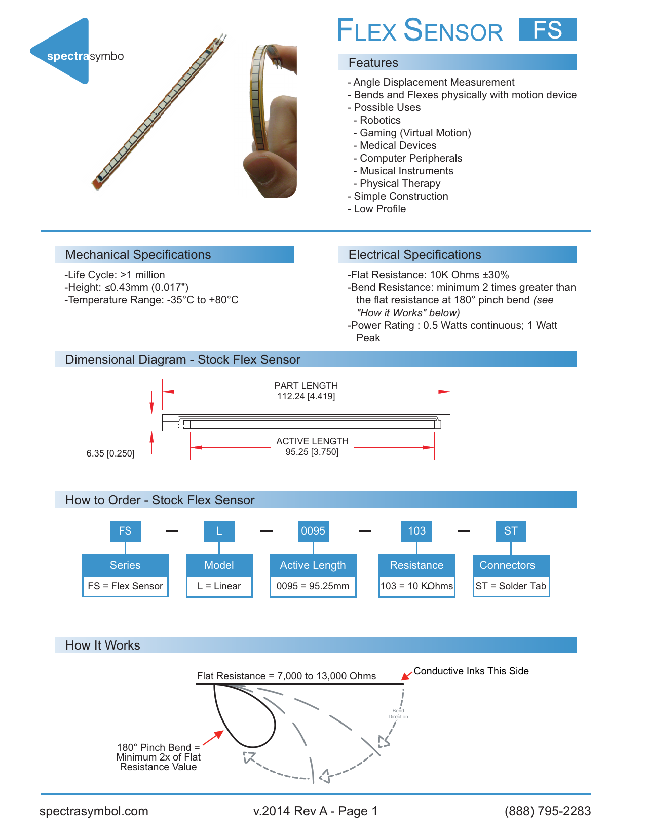 Features - Angle Displacement Measurement - Bends and Flexes physically with motion device - Possible Uses - Robotics - Gaming (Virtual Motion) - Medical Devices - Computer Peripherals - Musical Instruments - Physical Therapy - Simple Construction - Low Profile Mechanical Specifications Electrical Specifications -Life Cycle: >1 million -Flat Resistance: 10K Ohms ±30% -Height: 0.43mm (0.017") -Bend Resistance: minimum 2 times greater than -Temperature Range: -35°C to +80°C the flat resistance at 180° pinch bend (see "How it Works" below) -Power Rating : 0.5 Watts continuous; 1 Watt Peak Dimensional Diagram - Stock Flex Sensor PART LENGTH 112.24 [4.419] ACTIVE LENGTH 6.35 [0.250] 95.25 [3.750] How to Order - Stock Flex Sensor FS L 0095 103 ST Series Model Active Length Resistance Connectors FS = Flex Sensor L = Linear 0095 = 95.25mm 103 = 10 KOhms ST = Solder Tab How It Works Conductive Inks This Side Flat Resistance = 7,000 to 13,000 Ohms Bend Direction 180° Pinch Bend = Minimum 2x of Flat Resistance Value spectrasymbol.com v.2014 Rev A - Page 1 (888) 795-2283