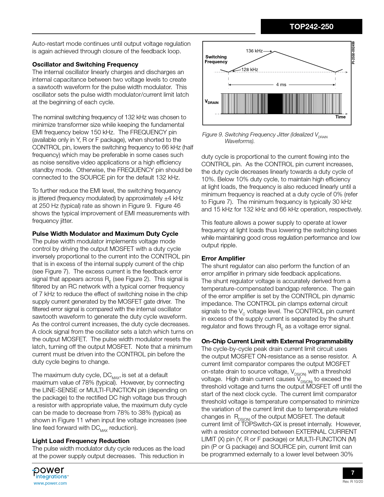 minimize transformer size while keeping the fundamental EMI frequency below 150 kHz. The FREQUENCY pin Figure 9. Switching Frequency Jitter (Idealized V (available only in Y, R or F package), when shorted to the DRAIN Waveforms). CONTROL pin, lowers the switching frequency to 66 kHz (half frequency) which may be preferable in some cases such duty cycle is proportional to the current flowing into the as noise sensitive video applications or a high efficiency CONTROL pin. As the CONTROL pin current increases, standby mode. Otherwise, the FREQUENCY pin should be the duty cycle decreases linearly towards a duty cycle of connected to the SOURCE pin for the default 132 kHz. 10%. Below 10% duty cycle, to maintain high efficiency at light loads, the frequency is also reduced linearly until a To further reduce the EMI level, the switching frequency minimum frequency is reached at a duty cycle of 0% (refer is jittered (frequency modulated) by approximately ±4 kHz to Figure 7). The minimum frequency is typically 30 kHz at 250 Hz (typical) rate as shown in Figure 9. Figure 46 and 15 kHz for 132 kHz and 66 kHz operation, respectively. shows the typical improvement of EMI measurements with frequency jitter. This feature allows a power supply to operate at lower frequency at light loads thus lowering the switching losses