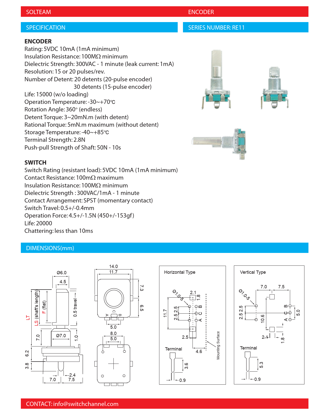 SOLTEAM ENCODER SPECIFICATION SERIES NUMBER: RE11 ENCODER. Rating: 5VDC 10mA (1mA minimum)