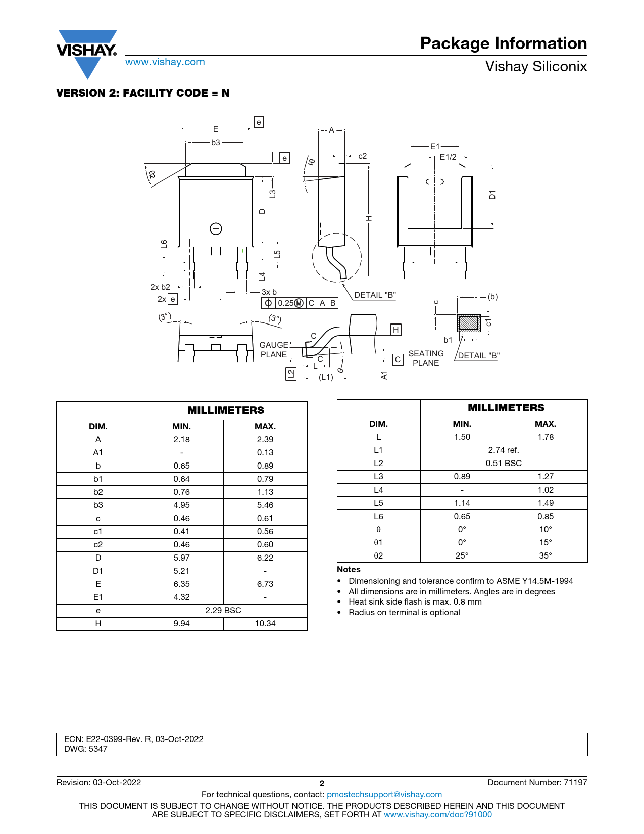 Package Information www.vishay.com Vishay Siliconix VERSION 2: FACILITY CODE = N e E A b3 E1 θ e c2 E1/2 θ L3 D1 D H L6 L5 L4 2x b2 3x b 2x e DETAIL "B" (b) 0.25 C A B c (3°) (3°) c1 H C b1 GAUGE PLANE SEATING C C DETAIL "B" L PLANE L2 θ (L1) A1 MILLIMETERSMILLIMETERSDIM.MIN.MAX.DIM.MIN.MAX. A 2.18 2.39 L 1.50 1.78 A1 - 0.13 L1 2.74 ref. b 0.65 0.89 L2 0.51 BSC b1 0.64 0.79 L3 0.89 1.27 b2 0.76 1.13 L4 - 1.02 b3 4.95 5.46 L5 1.14 1.49 c 0.46 0.61 L6 0.65 0.85 c1 0.41 0.56 0° 10° c2 0.46 0.60 1 0° 15° D 5.97 6.22 2 25° 35° Notes D1 5.21 - • Dimensioning and tolerance confirm to ASME Y14.5M-1994 E 6.35 6.73 • All dimensions are in millimeters. Angles are in degrees E1 4.32 - • Heat sink side flash is max. 0.8 mm e 2.29 BSC • Radius on terminal is optional H 9.94 10.34 ECN: E22-0399-Rev. R, 03-Oct-2022 DWG: 5347 Revision: 03-Oct-2022 2 Document Number: 71197 For technical questions, contact: pmostechsupport@vishay.com THIS DOCUMENT IS SUBJECT TO CHANGE WITHOUT NOTICE. THE PRODUCTS DESCRIBED HEREIN AND THIS DOCUMENT ARE SUBJECT TO SPECIFIC DISCLAIMERS, SET FORTH AT www.vishay.com/doc?91000