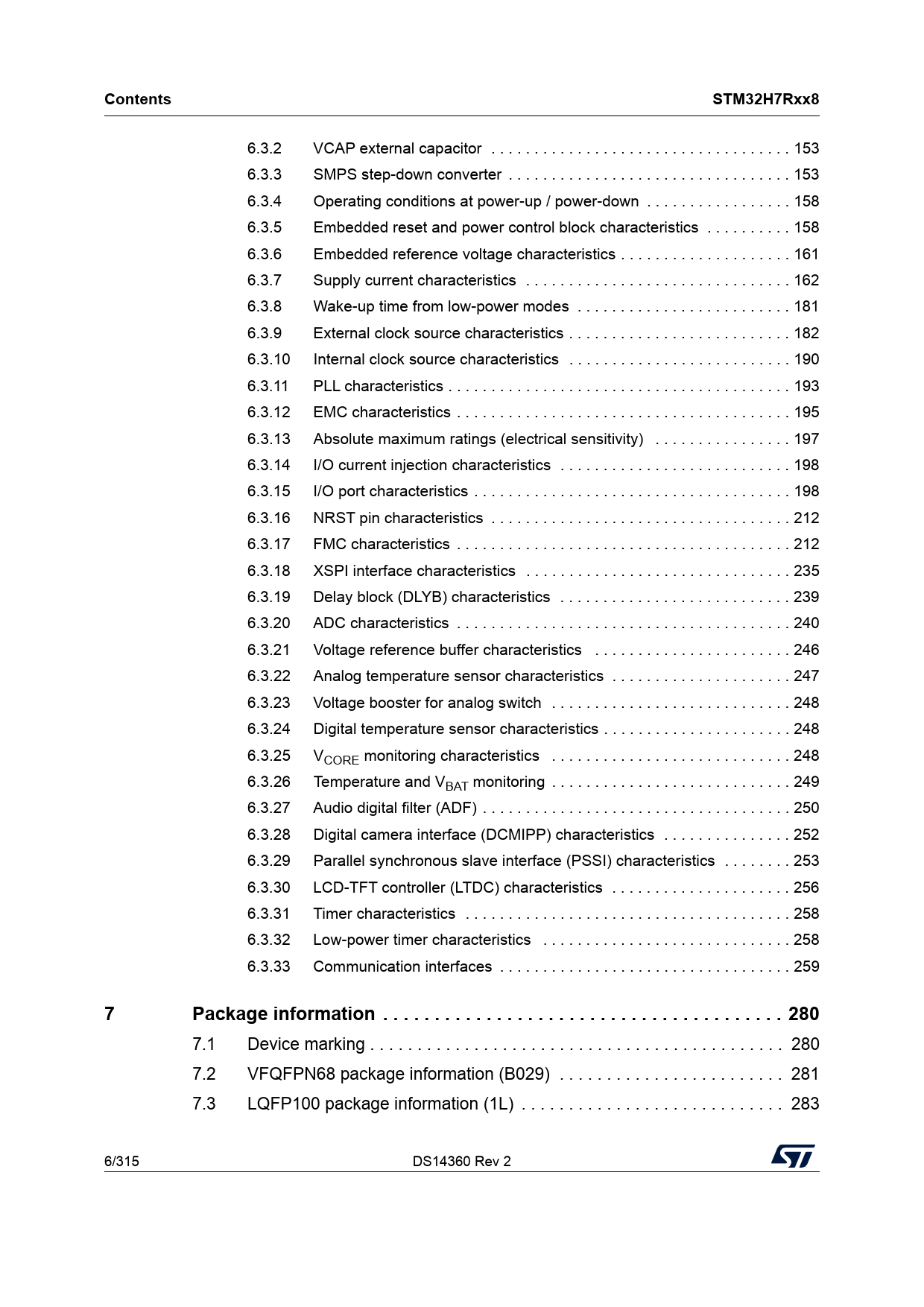 | Seiten / Seite | 315 / 6 — Contents. STM32H7Rxx8. ackage information . 280 |