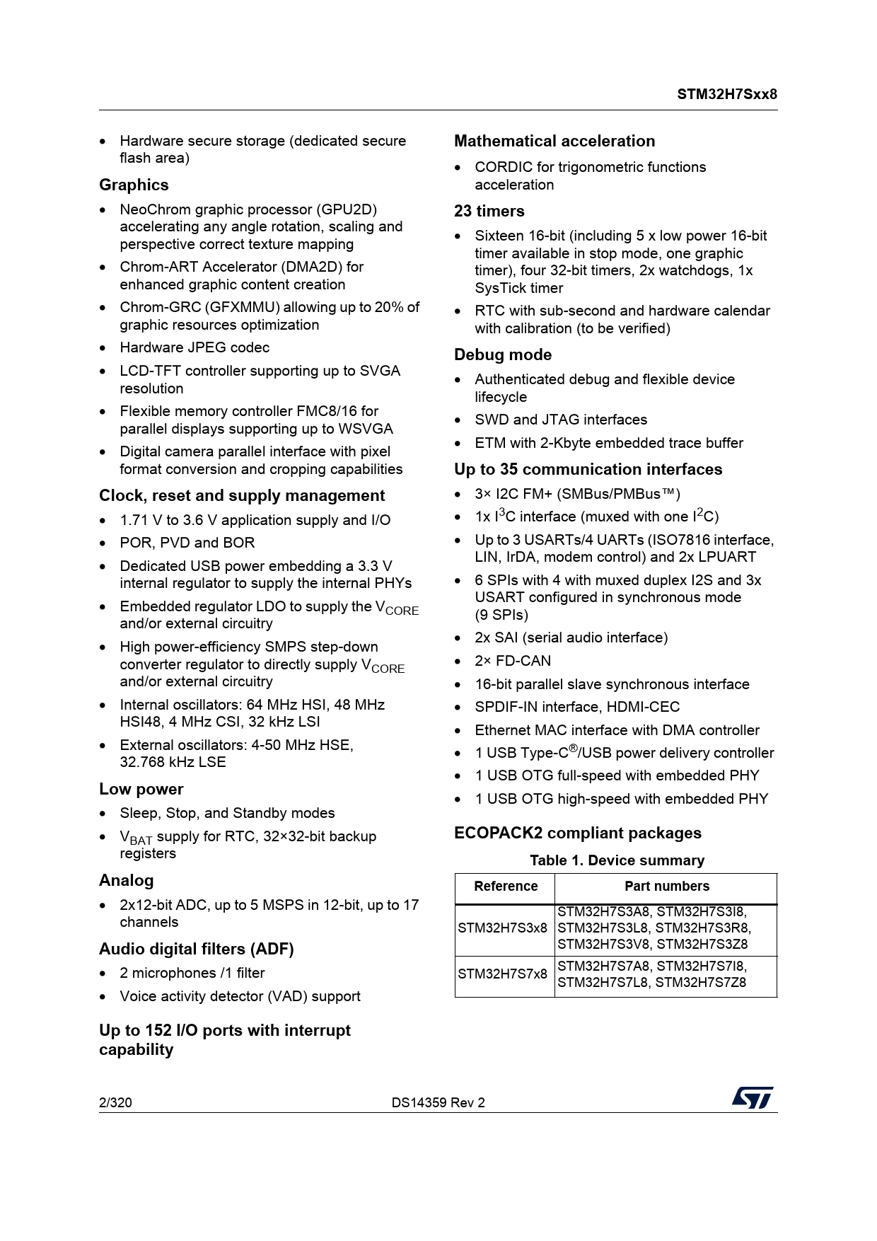 | Seiten / Seite | 320 / 2 — STM32H7Sxx8. Mathematical acceleration. Graphics. 23 timers. Debug mode. … |