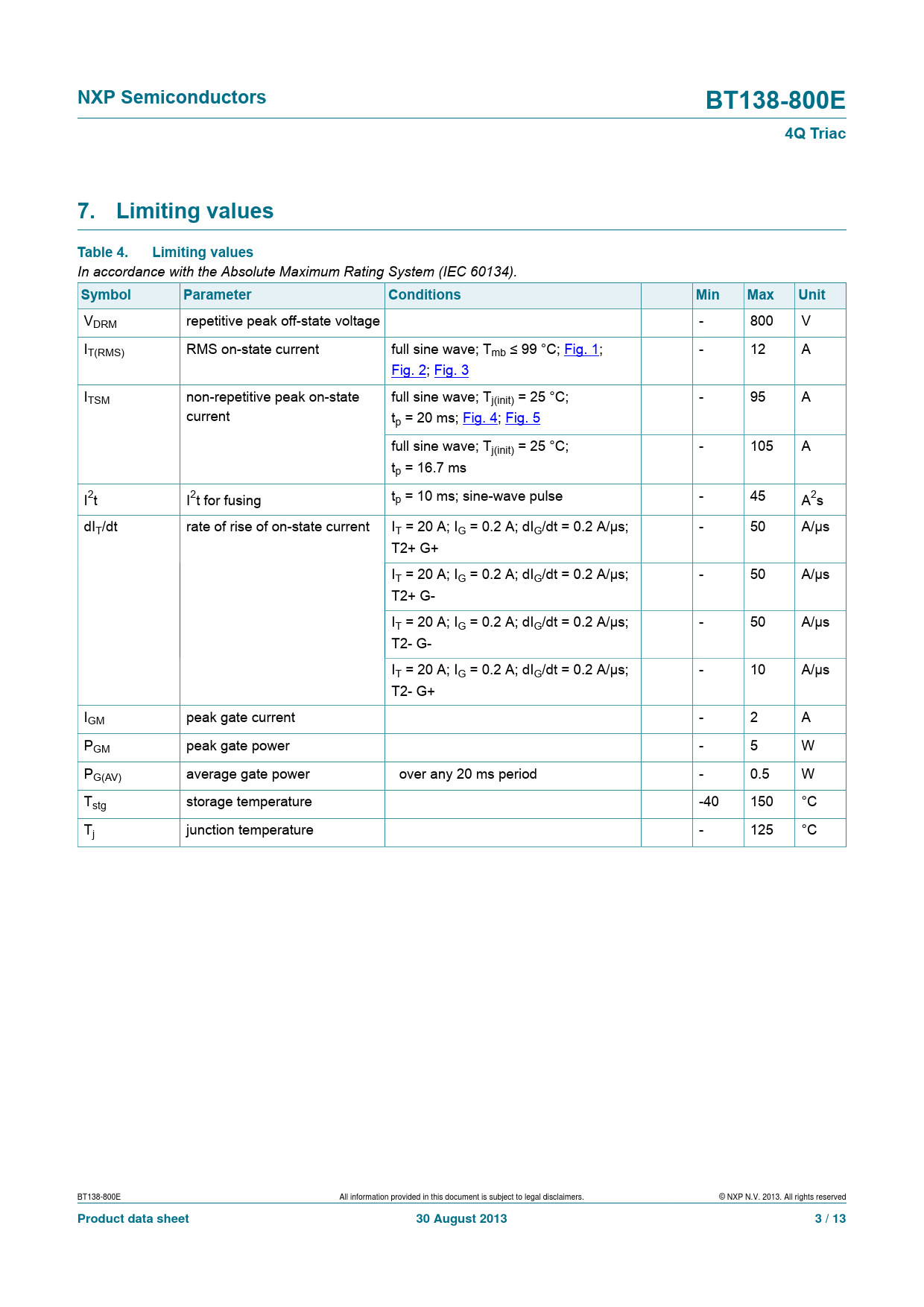 | Seiten / Seite | 13 / 3 — NXP Semiconductors. BT138-800E. 4Q Triac. 7. Limiting values. Table 4. … |