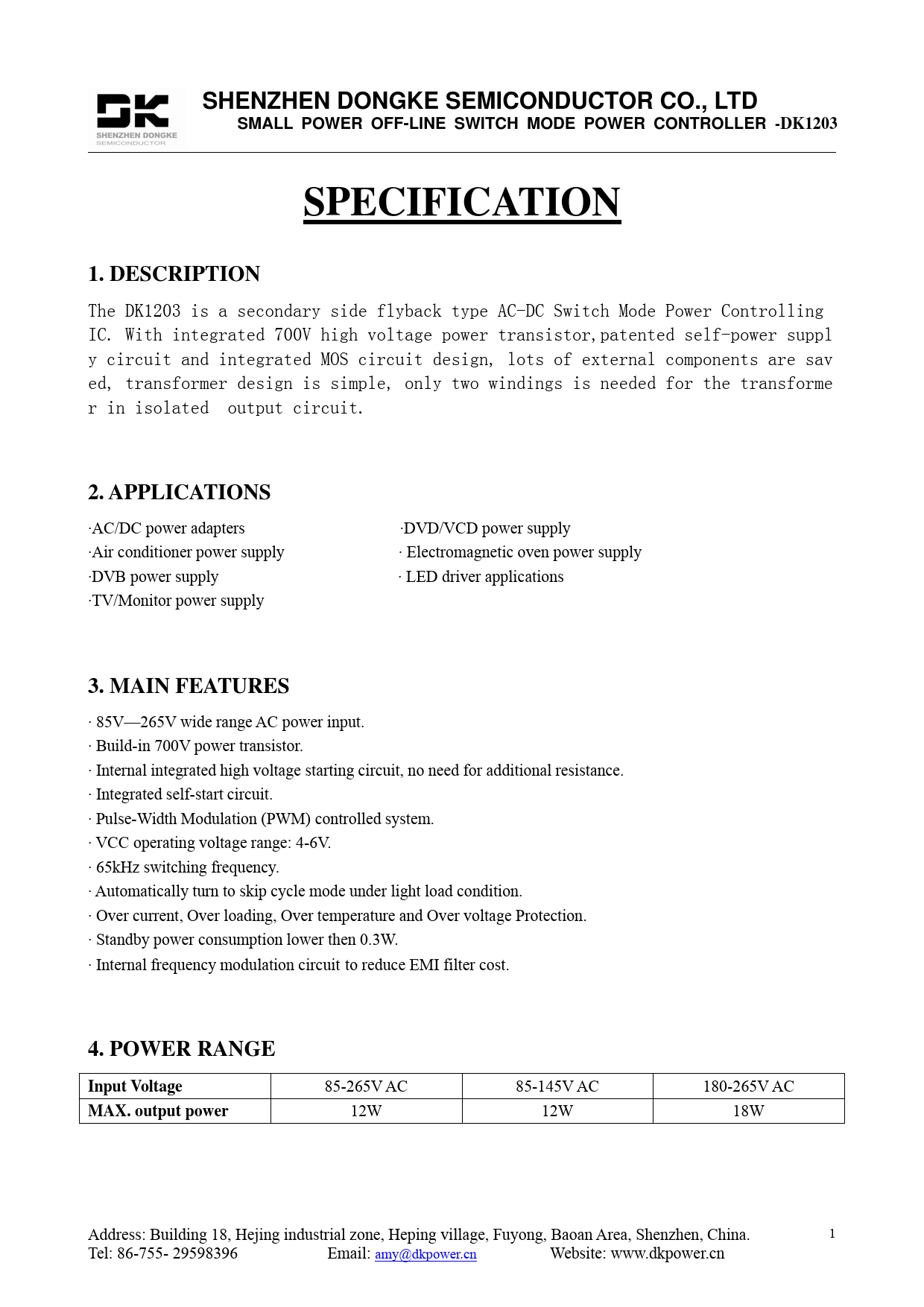 SHENZHEN DONGKE SEMICONDUCTOR CO., LTD. SMALL POWER OFF-LINE SWITCH MODE POWER CONTROLLER -DK1203. SPECIFICATION