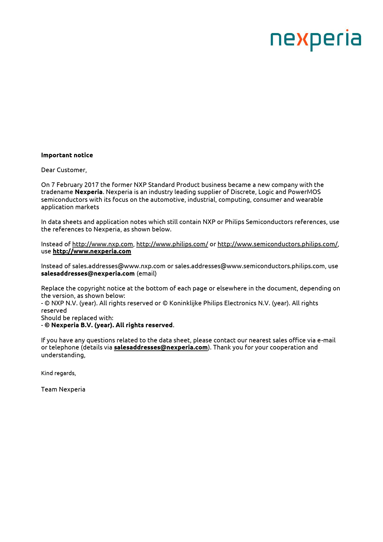 Important notice. Nexperia. http://www.nexperia.com. salesaddresses@nexperia.com. © Nexperia B.V. (year). All rights reserved