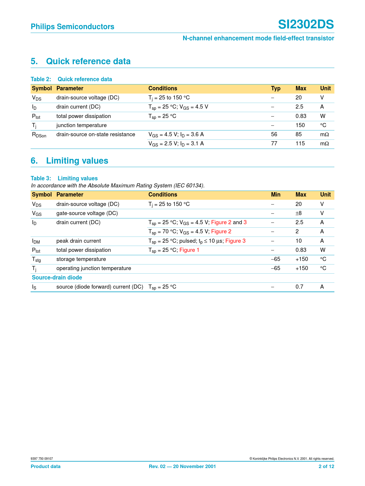 Philips Semiconductors. SI2302DS. N-channel enhancement mode field-effect transistor. Quick reference data. Table 2: