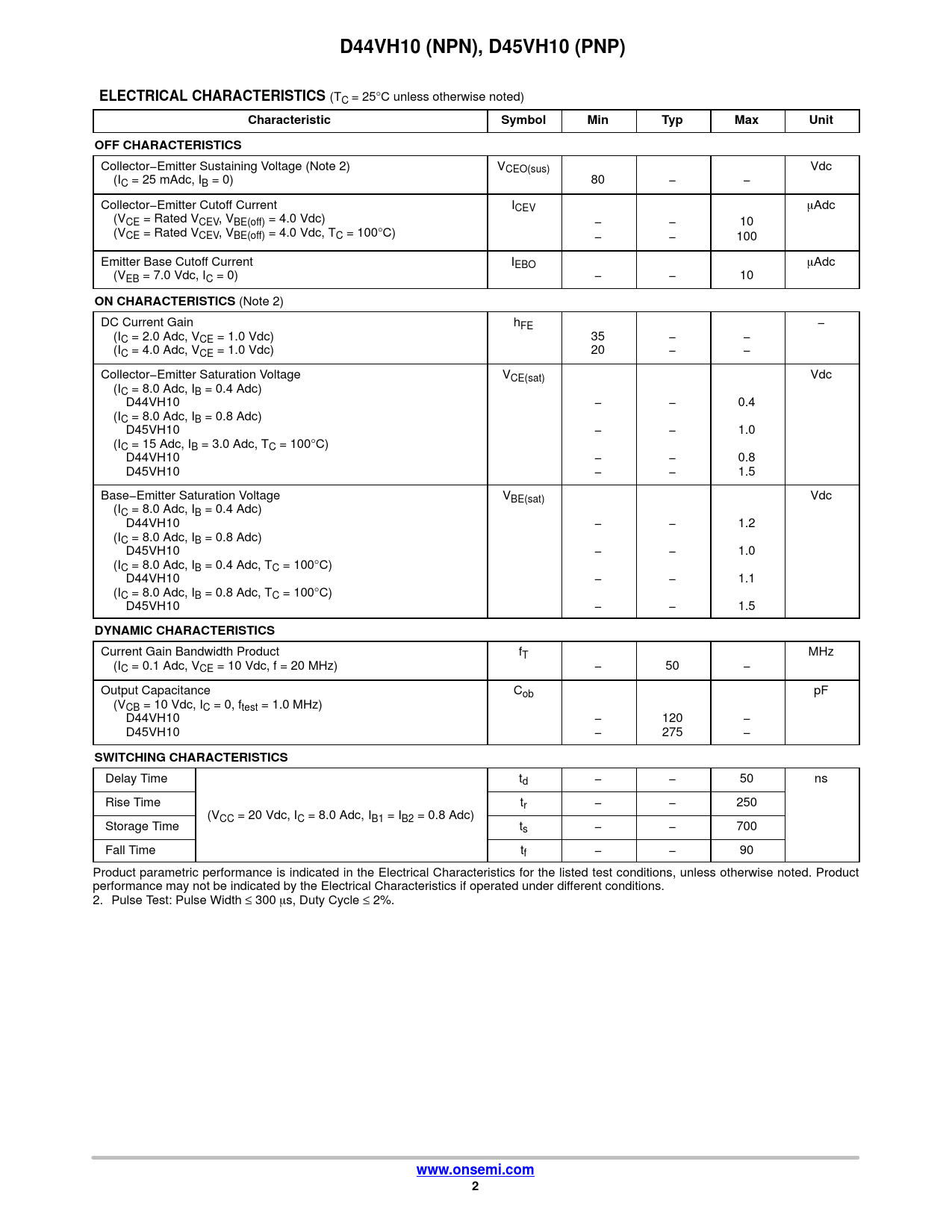 (Note 2) DC Current Gain hFE − (IC = 2.0 Adc, VCE = 1.0 Vdc) 35 − − (IC = 4.0 Adc, VCE = 1.0 Vdc) 20 − − Collector−Emitter Saturation Voltage VCE(sat) Vdc (IC = 8.0 Adc, IB = 0.4 Adc) D44VH10 − − 0.4 (IC = 8.0 Adc, IB = 0.8 Adc) D45VH10 − − 1.0 (IC = 15 Adc, IB = 3.0 Adc, TC = 100°C) D44VH10 − − 0.8 D45VH10 − − 1.5 Base−Emitter Saturation Voltage VBE(sat) Vdc (IC = 8.0 Adc, IB = 0.4 Adc) D44VH10 − − 1.2 (IC = 8.0 Adc, IB = 0.8 Adc) D45VH10 − − 1.0 (IC = 8.0 Adc, IB = 0.4 Adc, TC = 100°C) D44VH10 − − 1.1 (IC = 8.0 Adc, IB = 0.8 Adc, TC = 100°C) D45VH10 − − 1.5