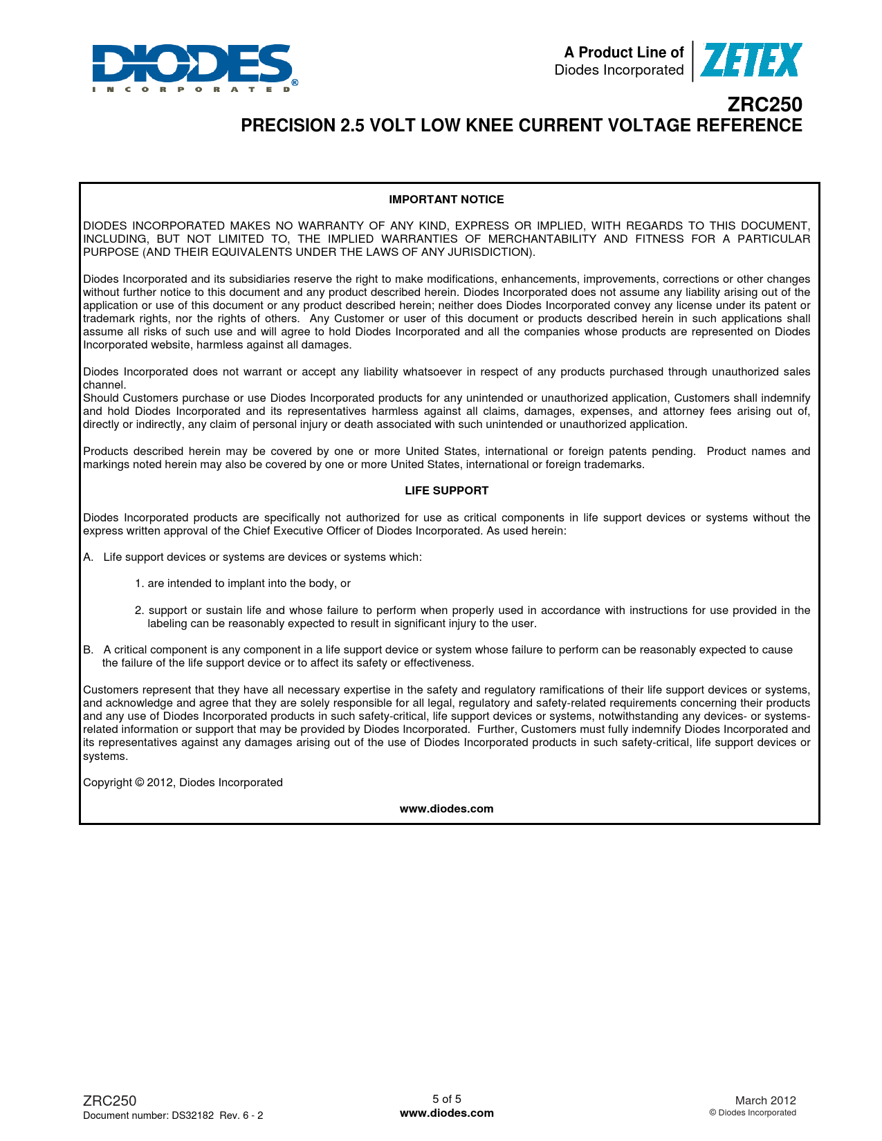 A Product Line of. ZRC250. PRECISION 2.5 VOLT LOW KNEE CURRENT VOLTAGE REFERENCE. IMPORTANT NOTICE. LIFE SUPPORT. www.diodes.com