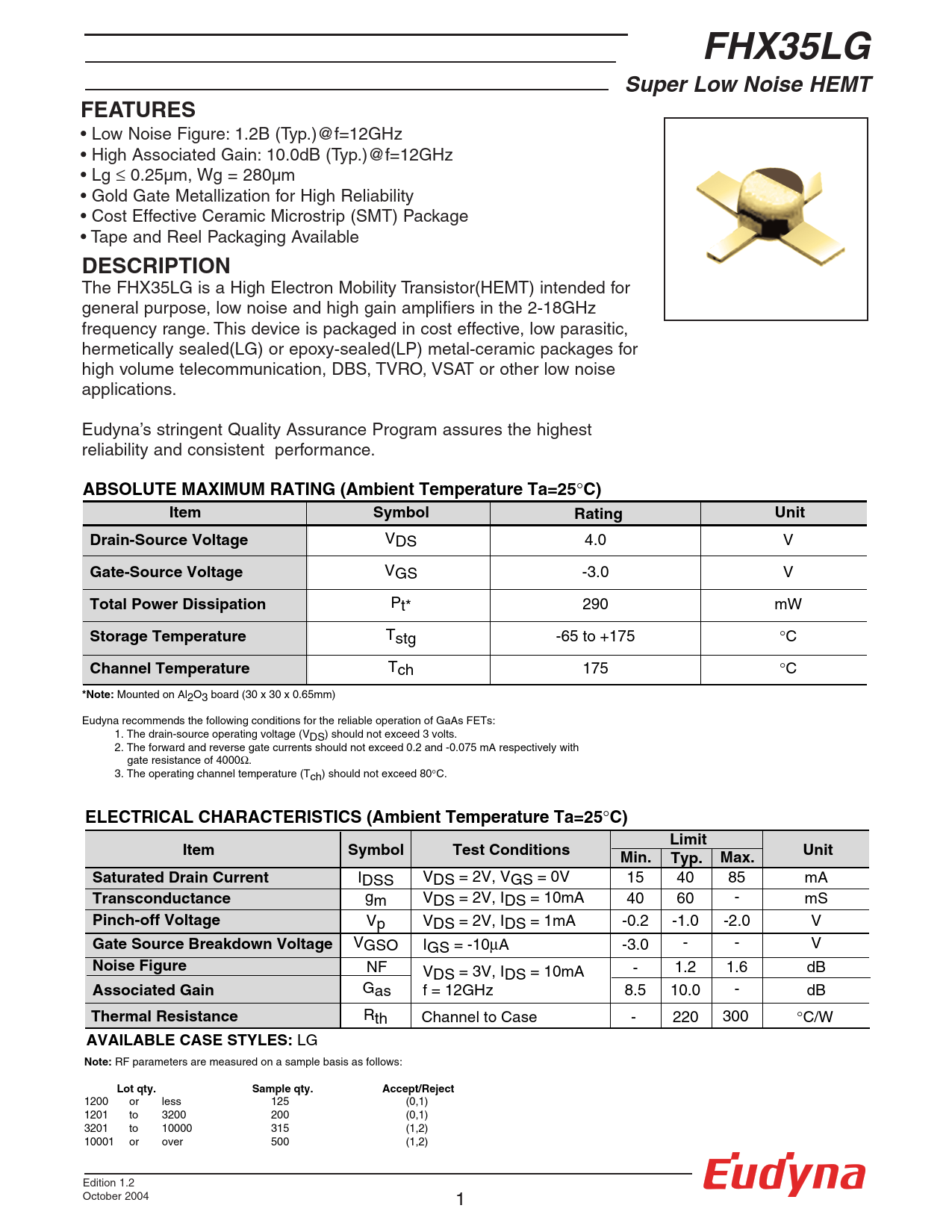 The FHX35LG is a High Electron Mobility Transistor(HEMT) intended for general purpose, low noise and high gain amplifiers in the 2-18GHz frequency range. This device is packaged in cost effective, low parasitic, hermetically sealed(LG) or epoxy-sealed(LP) metal-ceramic packages for high volume telecommunication, DBS, TVRO, VSAT or other low noise applications. Eudyna’s stringent Quality Assurance Program assures the highest reliability and consistent performance.