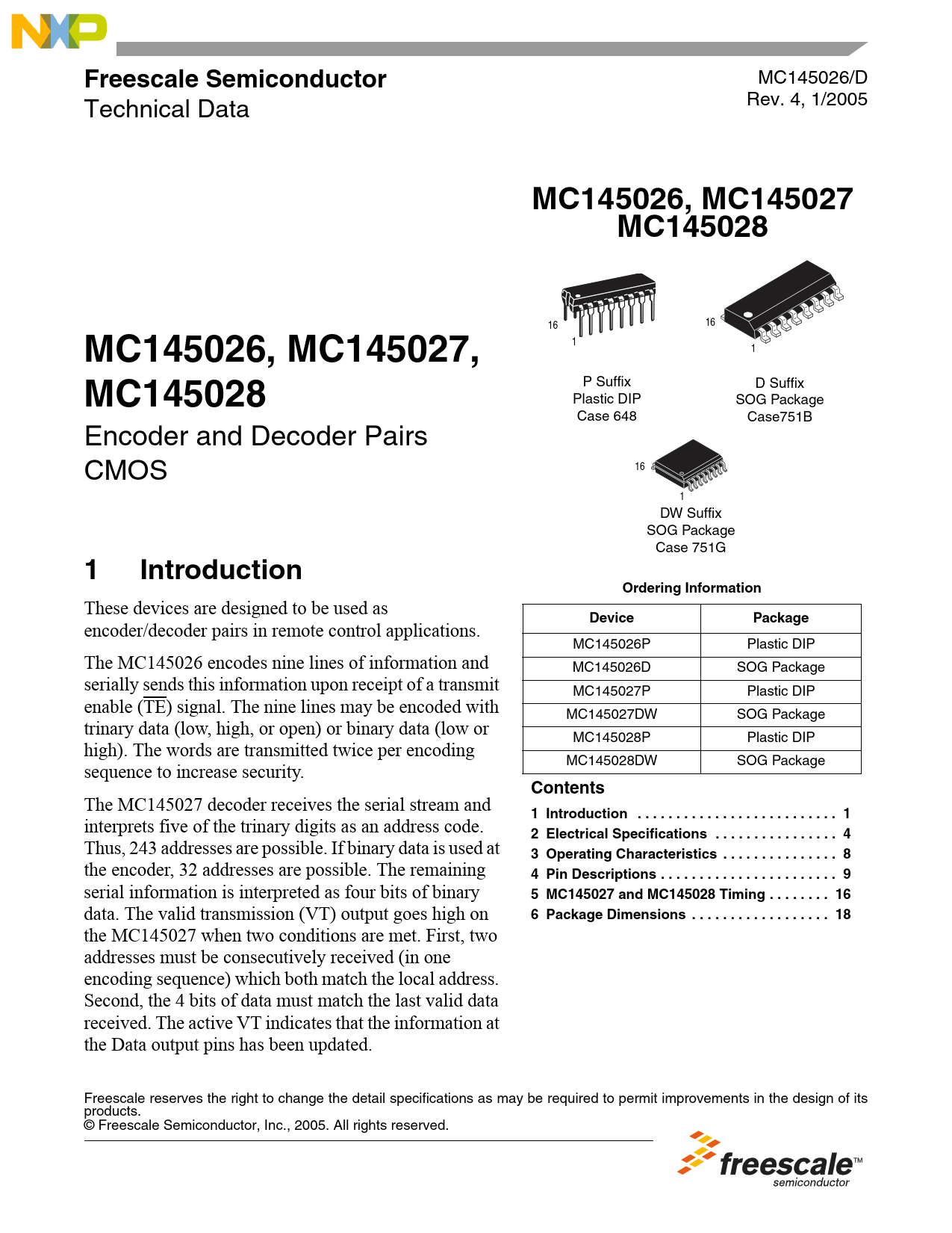 the MC145027 when two conditions are met. First, two addresses must be consecutively received (in one encoding sequence) which both match the local address. Second, the 4 bits of data must match the last valid data received. The active VT indicates that the information at the Data output pins has been updated. Freescale reserves the right to change the detail specifications as may be required to permit improvements in the design of its products. © Freescale Semiconductor, Inc., 2005. All rights reserved. Document Outline 1 Introduction 2 Electrical Specifications 3 Operating Characteristics 3.1 MC145026 3.2 MC145027 3.3 MC145028 4 Pin Descriptions 4.1 MC145026 Encoder 4.2 MC145027 and MC145028 Decoders 5 MC145027 and MC145028 Timing 6 Package Dimensions