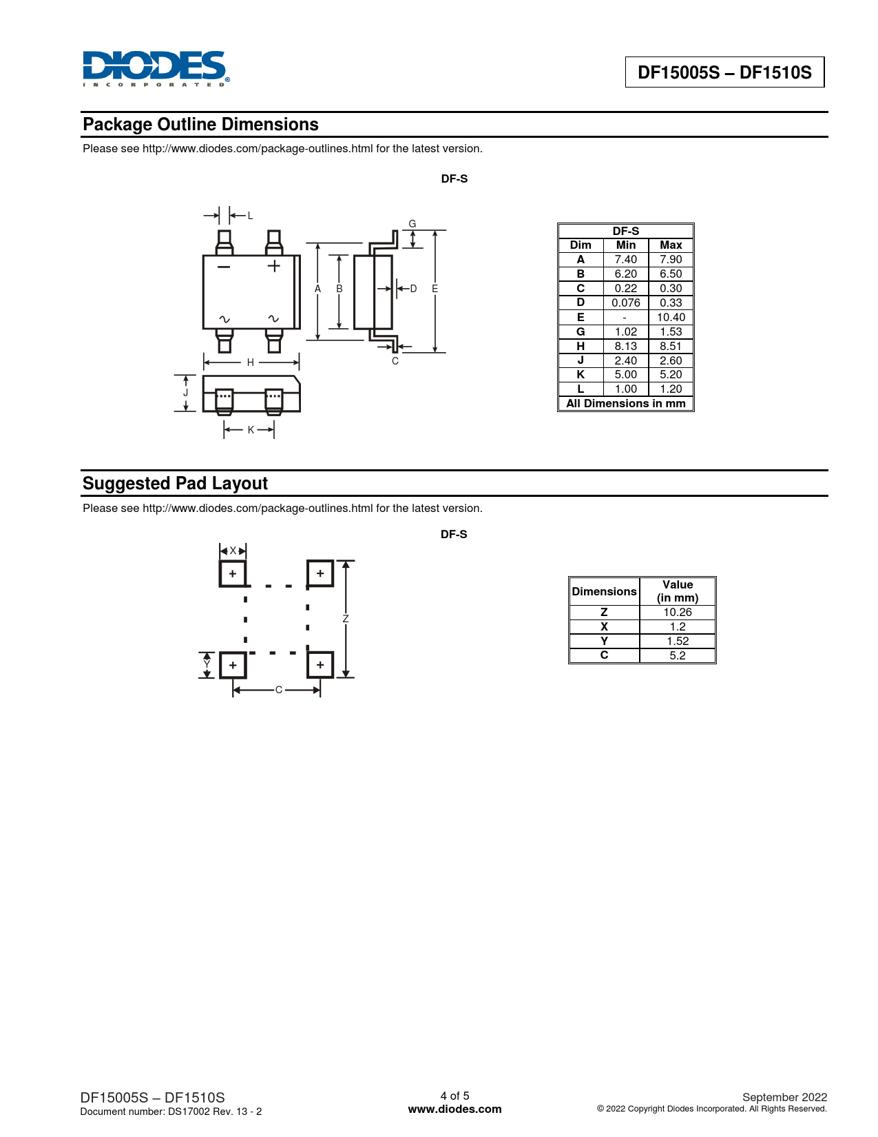 DF15005S – DF1510S. Package Outline Dimensions. DF-S. Dim. Min. Max. All Dimensions in mm. Suggested Pad Layout. Value. Dimensions. (in mm)