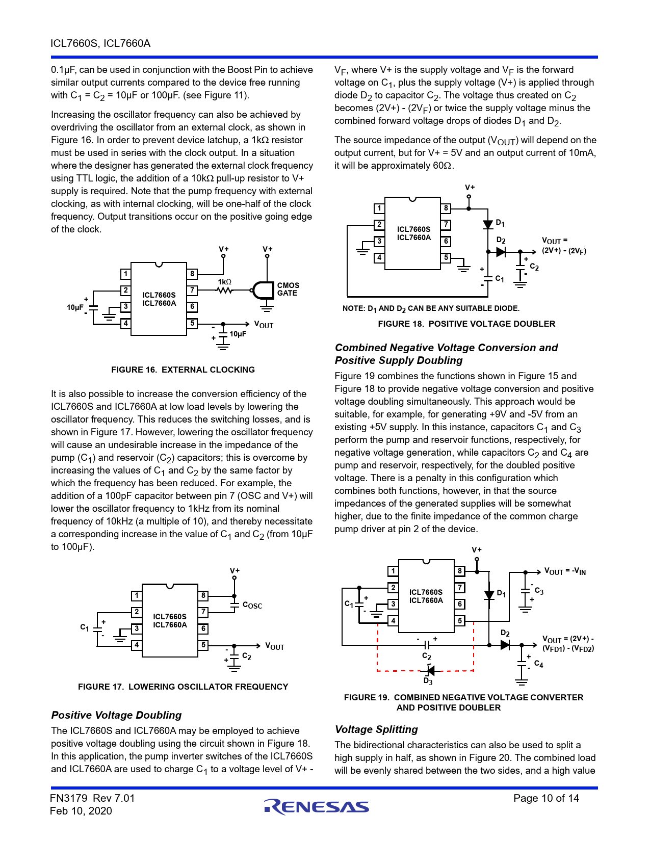 link to page 7 link to page 10 link to page 10 link to page 10 link to page 10 link to page 10 link to page 9 link to page 11 ICL7660S, ICL7660A 0.1µF, can be used in conjunction with the Boost Pin to achieve VF, where V+ is the supply voltage and VF is the forward similar output currents compared to the device free running voltage on C1, plus the supply voltage (V+) is applied through with C1 = C2 = 10µF or 100µF. (see Figure 11). diode D2 to capacitor C2. The voltage thus created on C2 becomes (2V+) - (2V Increasing the oscillator frequency can also be achieved by F) or twice the supply voltage minus the combined forward voltage drops of diodes D overdriving the oscillator from an external clock, as shown in 1 and D2. Figure 16. In order to prevent device latchup, a 1k resistor The source impedance of the output (VOUT) will depend on the must be used in series with the clock output. In a situation output current, but for V+ = 5V and an output current of 10mA, where the designer has generated the external clock frequency it will be approximately 60. using TTL logic, the addition of a 10k pull-up resistor to V+ supply is required. Note that the pump frequency with external V+ clocking, as with internal clocking, will be one-half of the clock 18 frequency. Output transitions occur on the positive going edge D of the clock. 271ICL7660S3ICL7660A6D2VOUT =V+V+(2V+) - (2VF)45+ C218+-1k Ω C1CMOS-27ICL7660SGATE+10µF3ICL7660A6-NOTE: D1 AND D2 CAN BE ANY SUITABLE DIODE.45VOUT-FIGURE 18. POSITIVE VOLTAGE DOUBLER10µF+Combined Negative Voltage Conversion and Positive Supply DoublingFIGURE 16. EXTERNAL CLOCKING Figure 19 combines the functions shown in Figure 15 and It is also possible to increase the conversion efficiency of the Figure 18 to provide negative voltage conversion and positive ICL7660S and ICL7660A at low load levels by lowering the voltage doubling simultaneously. This approach would be oscillator frequency. This reduces the switching losses, and is suitable, for example, for generating +9V and -5V from an shown in Figure 17. However, lowering the oscillator frequency existing +5V supply. In this instance, capacitors C1 and C3 will cause an undesirable increase in the impedance of the perform the pump and reservoir functions, respectively, for pump (C negative voltage generation, while capacitors C2 and C4 are 1) and reservoir (C2) capacitors; this is overcome by increasing the values of C pump and reservoir, respectively, for the doubled positive 1 and C2 by the same factor by which the frequency has been reduced. For example, the voltage. There is a penalty in this configuration which addition of a 100pF capacitor between pin 7 (OSC and V+) will combines both functions, however, in that the source lower the oscillator frequency to 1kHz from its nominal impedances of the generated supplies will be somewhat frequency of 10kHz (a multiple of 10), and thereby necessitate higher, due to the finite impedance of the common charge a corresponding increase in the value of C pump driver at pin 2 of the device. 1 and C2 (from 10µF to 100µF). V+V+18VOUT = -VIN27- C18ICL7660SD13+ICL7660A+COSCC13627-ICL7660S+45CICL7660A136-D2-+VOUT = (2V+) -45VOUT-(VFD1) - (VFD2)CC+22+ C4-DFIGURE 17. LOWERING OSCILLATOR FREQUENCY3FIGURE 19. COMBINED NEGATIVE VOLTAGE CONVERTERAND POSITIVE DOUBLERPositive Voltage Doubling The ICL7660S and ICL7660A may be employed to achieve Voltage Splitting positive voltage doubling using the circuit shown in Figure 18. The bidirectional characteristics can also be used to split a In this application, the pump inverter switches of the ICL7660S high supply in half, as shown in Figure 20. The combined load and ICL7660A are used to charge C1 to a voltage level of V+ - will be evenly shared between the two sides, and a high value FN3179 Rev 7.01 Page 10 of 14 Feb 10, 2020
