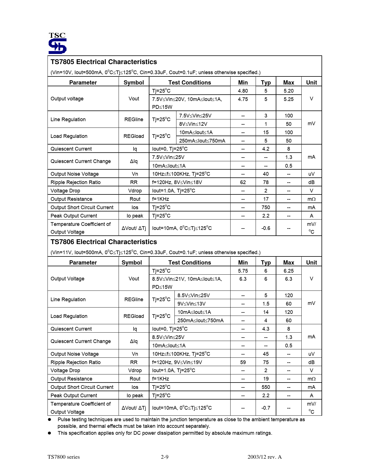 TS7805 Electrical Characteristics Parameter Symbol Test Conditions Min Typ Max Unit TS7806 Electrical Characteristics