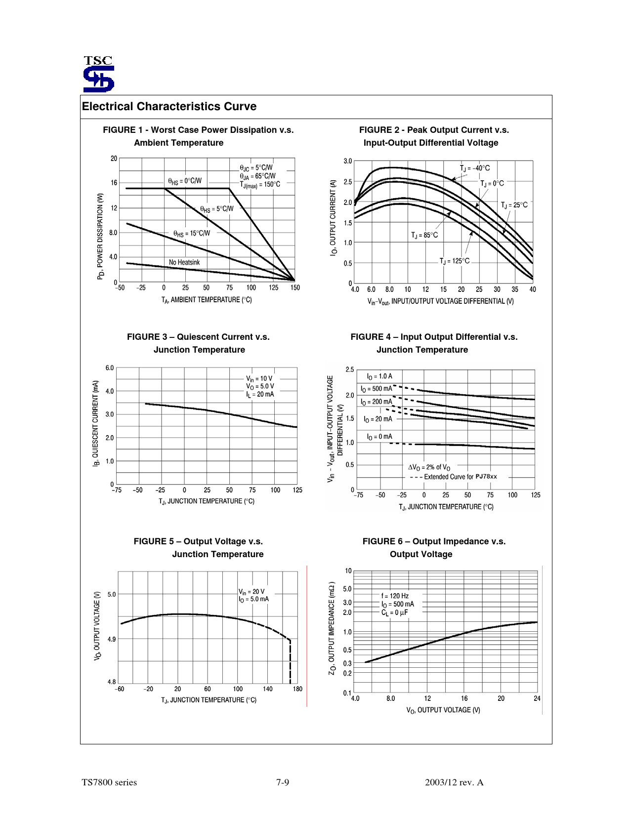 Electrical Characteristics Curve FIGURE 1 - Worst Case Power Dissipation v.s. FIGURE 2 - Peak Output Current v.s. Ambient Temperature Input-Output Differential Voltage FIGURE 3 – Quiescent Current v.s. FIGURE 4 – Input Output Differential v.s. Junction Temperature Junction Temperature FIGURE 5 – Output Voltage v.s. FIGURE 6 – Output Impedance v.s. Junction Temperature Output Voltage
