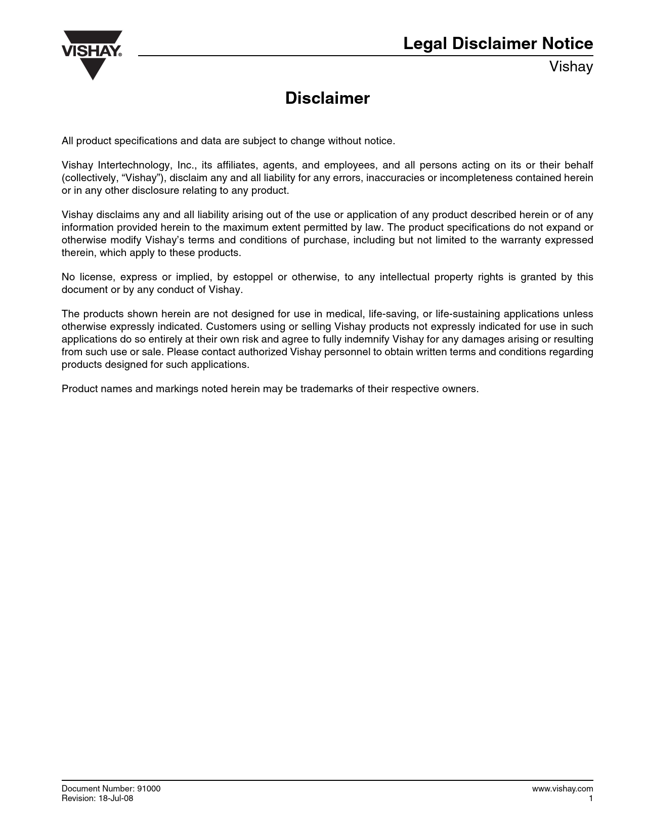 All product specifications and data are subject to change without notice. Vishay Intertechnology, Inc., its affiliates, agents, and employees, and all persons acting on its or their behalf (collectively, “Vishay”), disclaim any and all liability for any errors, inaccuracies or incompleteness contained herein or in any other disclosure relating to any product. Vishay disclaims any and all liability arising out of the use or application of any product described herein or of any information provided herein to the maximum extent permitted by law. The product specifications do not expand or otherwise modify Vishay’s terms and conditions of purchase, including but not limited to the warranty expressed therein, which apply to these products. No license, express or implied, by estoppel or otherwise, to any intellectual property rights is granted by this document or by any conduct of Vishay. The products shown herein are not designed for use in medical, life-saving, or life-sustaining applications unless otherwise expressly indicated. Customers using or selling Vishay products not expressly indicated for use in such applications do so entirely at their own risk and agree to fully indemnify Vishay for any damages arising or resulting from such use or sale. Please contact authorized Vishay personnel to obtain written terms and conditions regarding products designed for such applications. Product names and markings noted herein may be trademarks of their respective owners. Document Number: 91000 www.vishay.com Revision: 18-Jul-08 1 Document Outline Datasheet Disclaimer