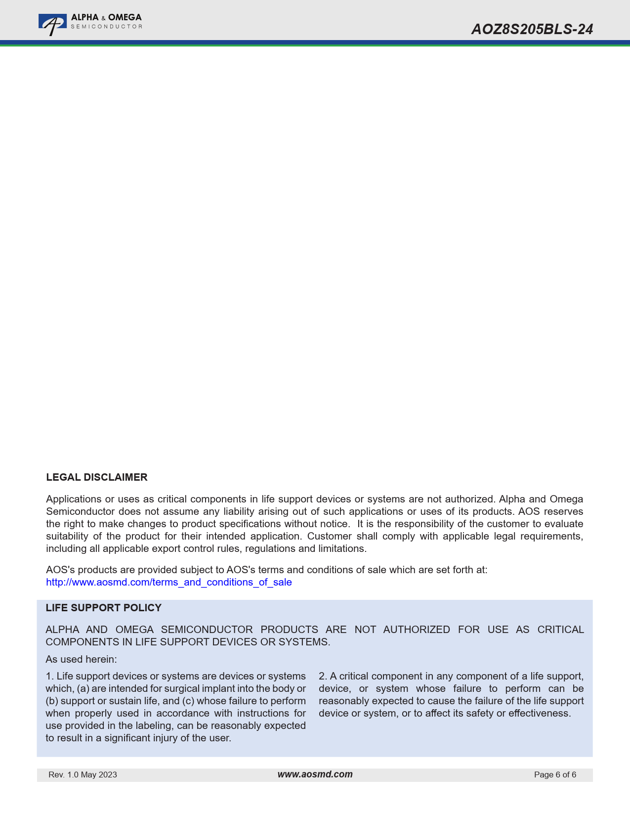 Seiten / Seite6 / 6 — AOZ8S205BLS-24. LEGAL DISCLAIMER. LIFE SUPPORT POLICY. www.aosmd.com
