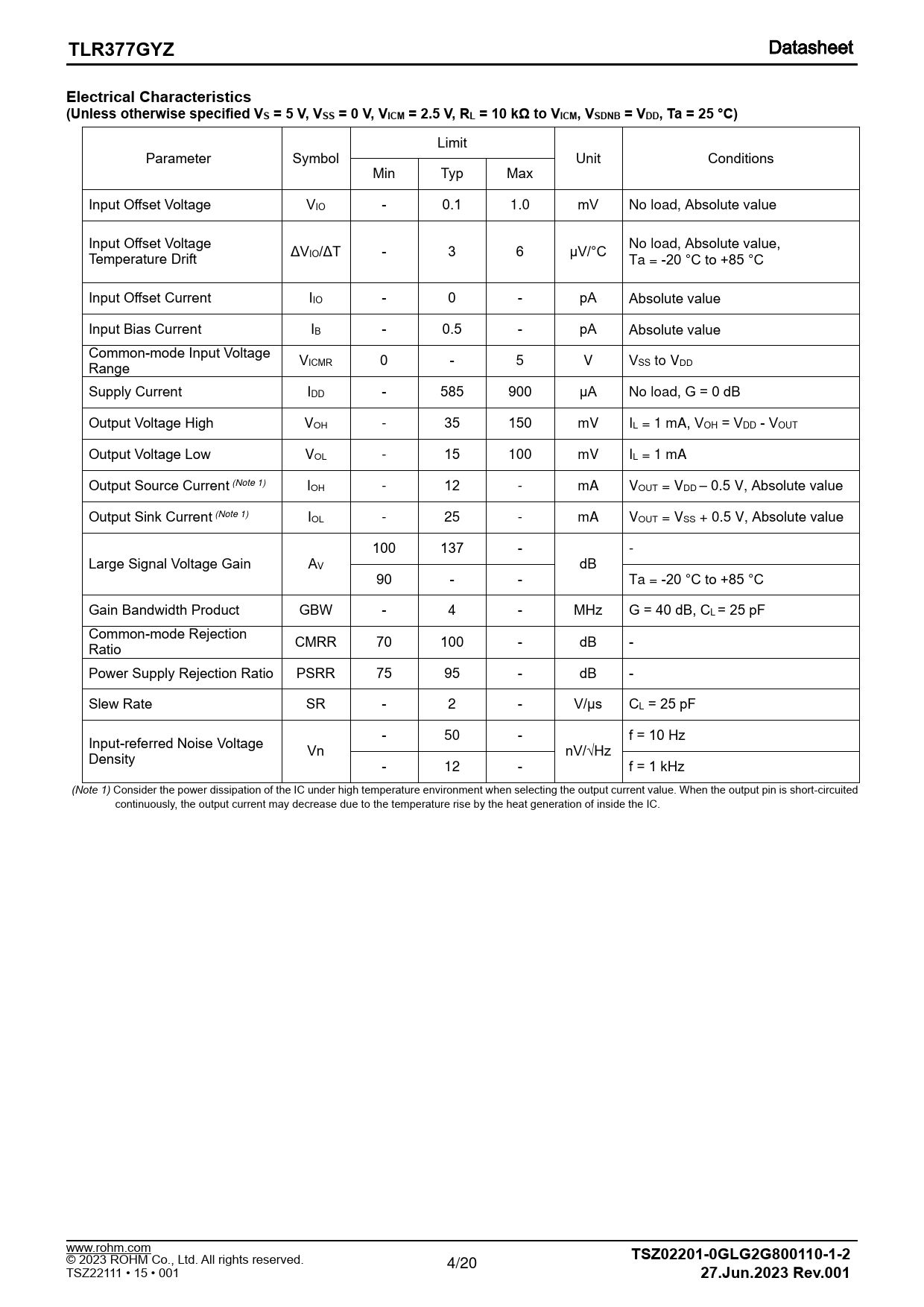 Limit Parameter Symbol Unit Conditions Min Typ Max Input Offset Voltage VIO - 0.1 1.0 mV No load, Absolute value Input Offset Voltage ΔV No load, Absolute value, Temperature Drift IO/ΔT - 3 6 μV/°C Ta = -20 °C to +85 °C Input Offset Current IIO - 0 - pA Absolute value Input Bias Current IB - 0.5 - pA Absolute value Common-mode Input Voltage Range VICMR 0 - 5 V VSS to V DD Supply Current IDD - 585 900 μA No load, G = 0 dB Output Voltage High VOH - 35 150 mV IL = 1 mA, VOH = VDD - VOUT Output Voltage Low VOL - 15 100 mV IL = 1 mA Output Source Current (Note 1) IOH - 12 - mA VOUT = VDD – 0.5 V, Absolute value Output Sink Current (Note 1) IOL - 25 - mA VOUT = VSS + 0.5 V, Absolute value 100 137 - - Large Signal Voltage Gain AV dB 90 - - Ta = -20 °C to +85 °C Gain Bandwidth Product GBW - 4 - MHz G = 40 dB, CL = 25 pF Common-mode Rejection Ratio CMRR 70 100 - dB - Power Supply Rejection Ratio PSRR 75 95 - dB - Slew Rate SR - 2 - V/μs CL = 25 pF - f = 10 Hz Input-referred Noise Voltage 50 - Vn nV/√Hz Density - 12 - f = 1 kHz (Note 1) Consider the power dissipation of the IC under high temperature environment when selecting the output current value. When the output pin is short-circuited continuously, the output current may decrease due to the temperature rise by the heat generation of inside the IC. www.rohm.com