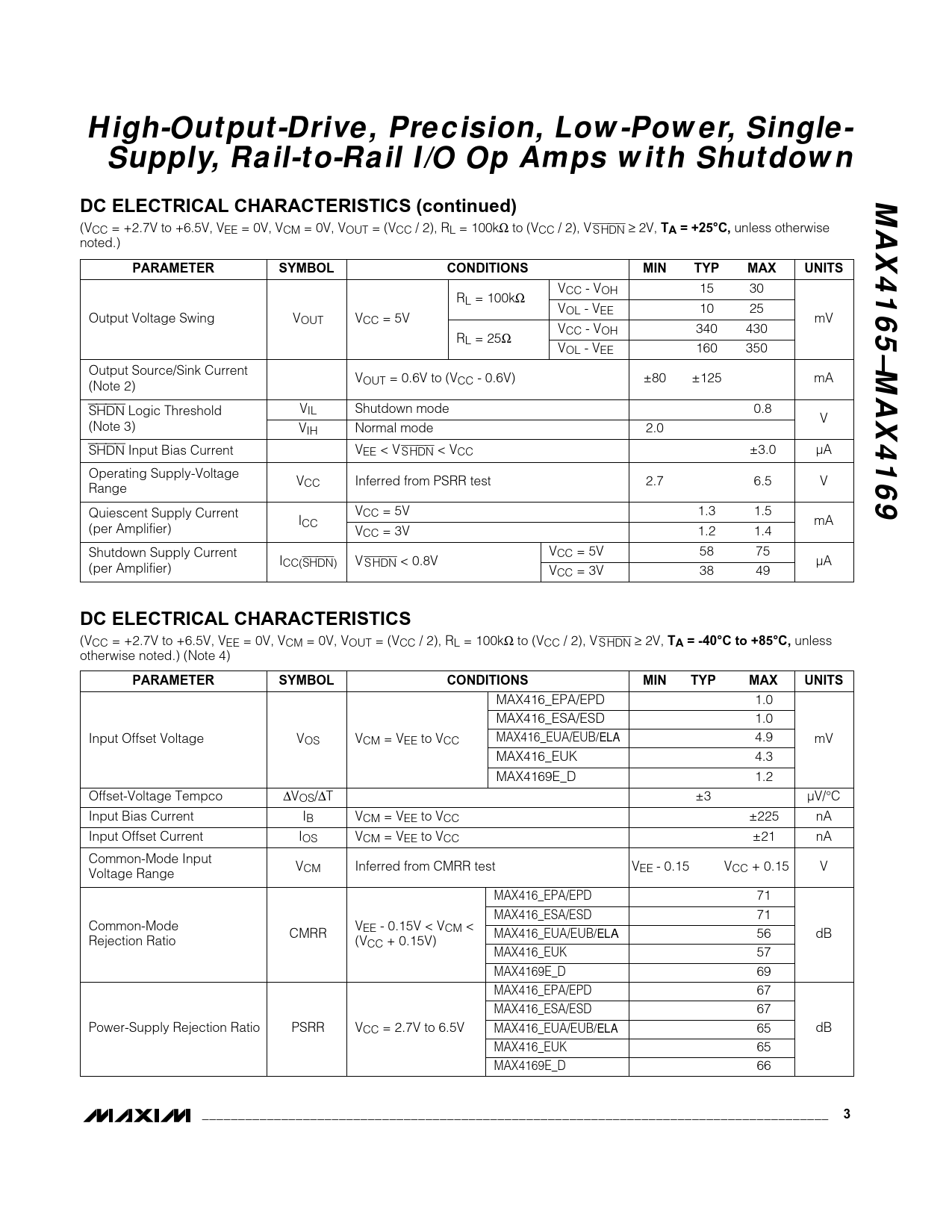 High-Output-Drive, Precision, Low-Power, Single-Supply, Rail-to-Rail I/O Op Amps with ShutdownMAX4165–MAX416DC ELECTRICAL CHARACTERISTICS (continued) (VCC = +2.7V to +6.5V, VEE = 0V, VCM = 0V, VOUT = (VCC / 2), RL = 100kΩ to (VCC / 2), VSHDN ≥ 2V, TA = +25°C, unless otherwise noted.) PARAMETERSYMBOLCONDITIONSMINTYPMAXUNITS V R CC - VOH 15 30 L = 100kΩ V Output Voltage Swing V OL - VEE 10 25 OUT VCC = 5V mV V R CC - VOH 340 430 L = 25Ω VOL - VEE 160 350 Output Source/Sink Current V (Note 2) OUT = 0.6V to (VCC - 0.6V) ±80 ±125 mA SHDN Logic Threshold VIL Shutdown mode 0.8 V (Note 3) VIH Normal mode 2.0 SHDN Input Bias Current VEE < VSHDN < VCC ±3.0 µA Operating Supply-Voltage V Range CC Inferred from PSRR test 2.7 6.5 V 9 Quiescent Supply Current V I CC = 5V 1.3 1.5 CC mA (per Amplifier) VCC = 3V 1.2 1.4 Shutdown Supply Current V ICC(SHDN) V CC = 5V 58 75 S HDN < 0.8V µA (per Amplifier) VCC = 3V 38 49 DC ELECTRICAL CHARACTERISTICS (VCC = +2.7V to +6.5V, VEE = 0V, VCM = 0V, VOUT = (VCC / 2), RL = 100kΩ to (VCC / 2), VSHDN ≥ 2V, TA = -40°C to +85°C, unless otherwise noted.) (Note 4) PARAMETERSYMBOLCONDITIONSMINTYPMAXUNITS MAX416_EPA/EPD 1.0 MAX416_ESA/ESD 1.0 Input Offset Voltage VOS VCM = VEE to VCC MAX416_EUA/EUB/ELA 4.9 mV MAX416_EUK 4.3 MAX4169E_D 1.2 Offset-Voltage Tempco ΔVOS/ΔT ±3 µV/°C Input Bias Current IB VCM = VEE to VCC ±225 nA Input Offset Current IOS VCM = VEE to VCC ±21 nA Common-Mode Input V Voltage Range CM Inferred from CMRR test VEE - 0.15 VCC + 0.15 V MAX416_EPA/EPD 71 MAX416_ESA/ESD 71 Common-Mode V CMRR EE - 0.15V < VCM < MAX416_EUA/EUB/ELA 56 dB Rejection Ratio (VCC + 0.15V) MAX416_EUK 57 MAX4169E_D 69 MAX416_EPA/EPD 67 MAX416_ESA/ESD 67 Power-Supply Rejection Ratio PSRR VCC = 2.7V to 6.5V MAX416_EUA/EUB/ELA 65 dB MAX416_EUK 65 MAX4169E_D 66 _______________________________________________________________________________________ 3