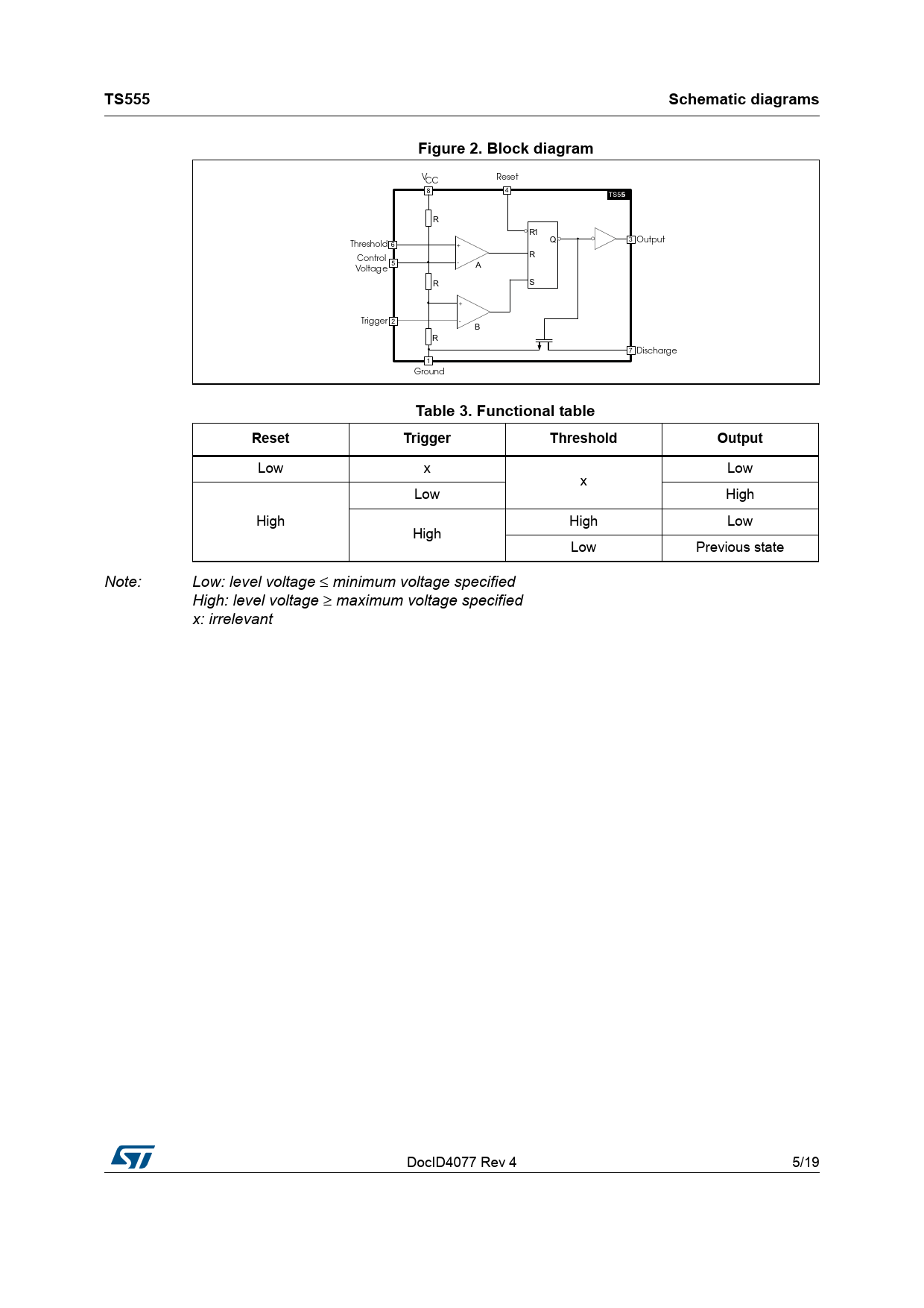 TS555. Schematic diagrams. Figure 2. Block diagram. Table 3. Functional table. Reset. Trigger. Threshold. Output