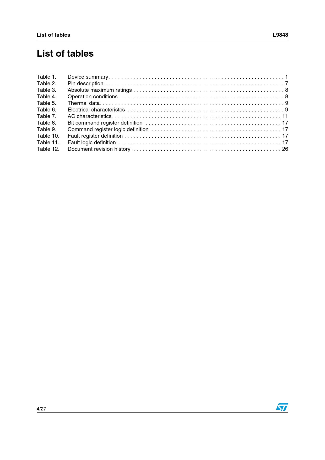 | Seiten / Seite | 27 / 4 — List of tables. L9848 |