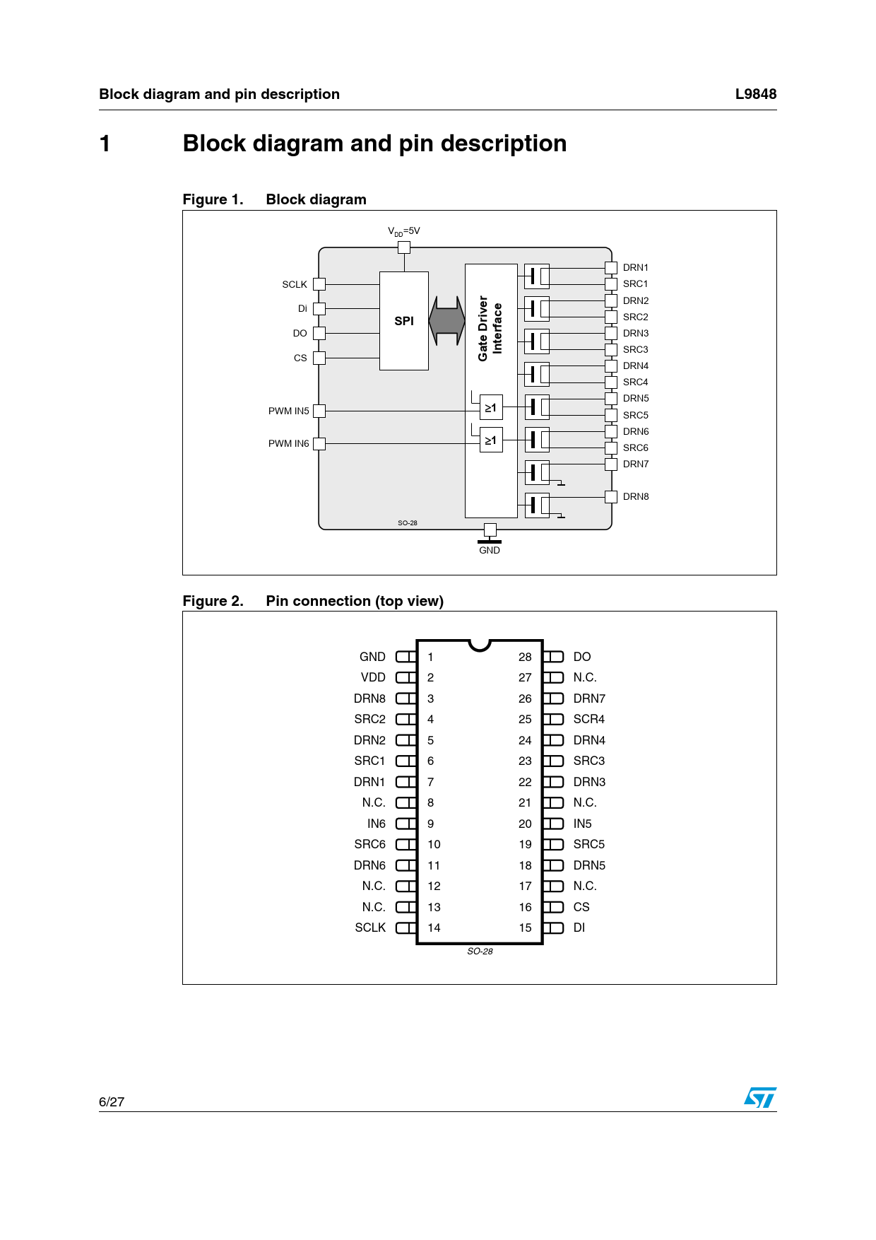Block diagram and pin description. L9848. Figure 1. Block diagram. SPI. ate. Interface. Figure 2. Pin connection (top view)