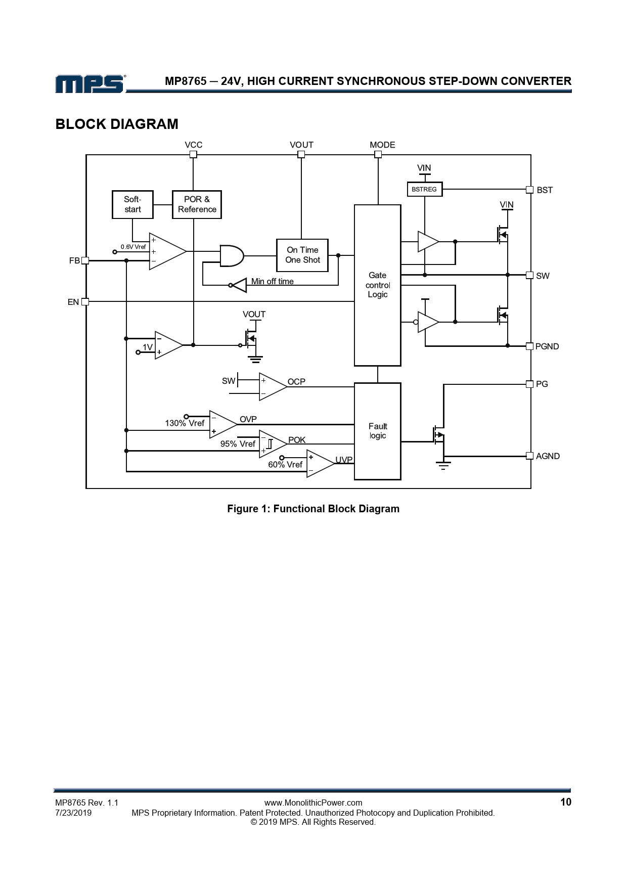 MP8765 ─ 24V, HIGH CURRENT SYNCHRONOUS STEP-DOWN CONVERTER. BLOCK DIAGRAM. Figure 1: Functional Block Diagram