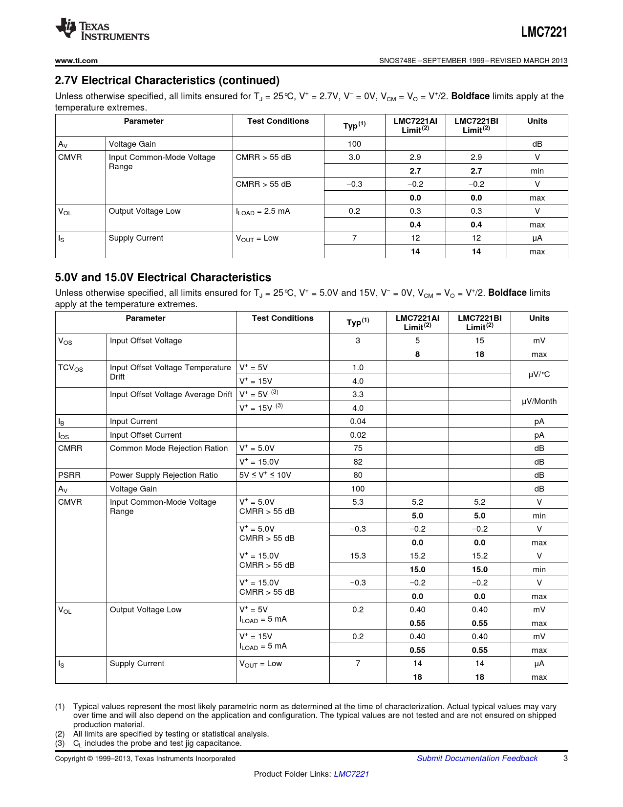 LMC7221. www.ti.com. 2.7V Electrical Characteristics (continued). Boldface. Parameter. Test Conditions. LMC7221AI. LMC7221BI. Units