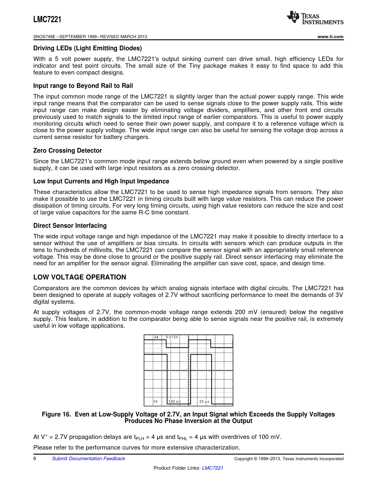 LMC7221. www.ti.com. Driving LEDs (Light Emitting Diodes). Input range to Beyond Rail to Rail. Zero Crossing Detector