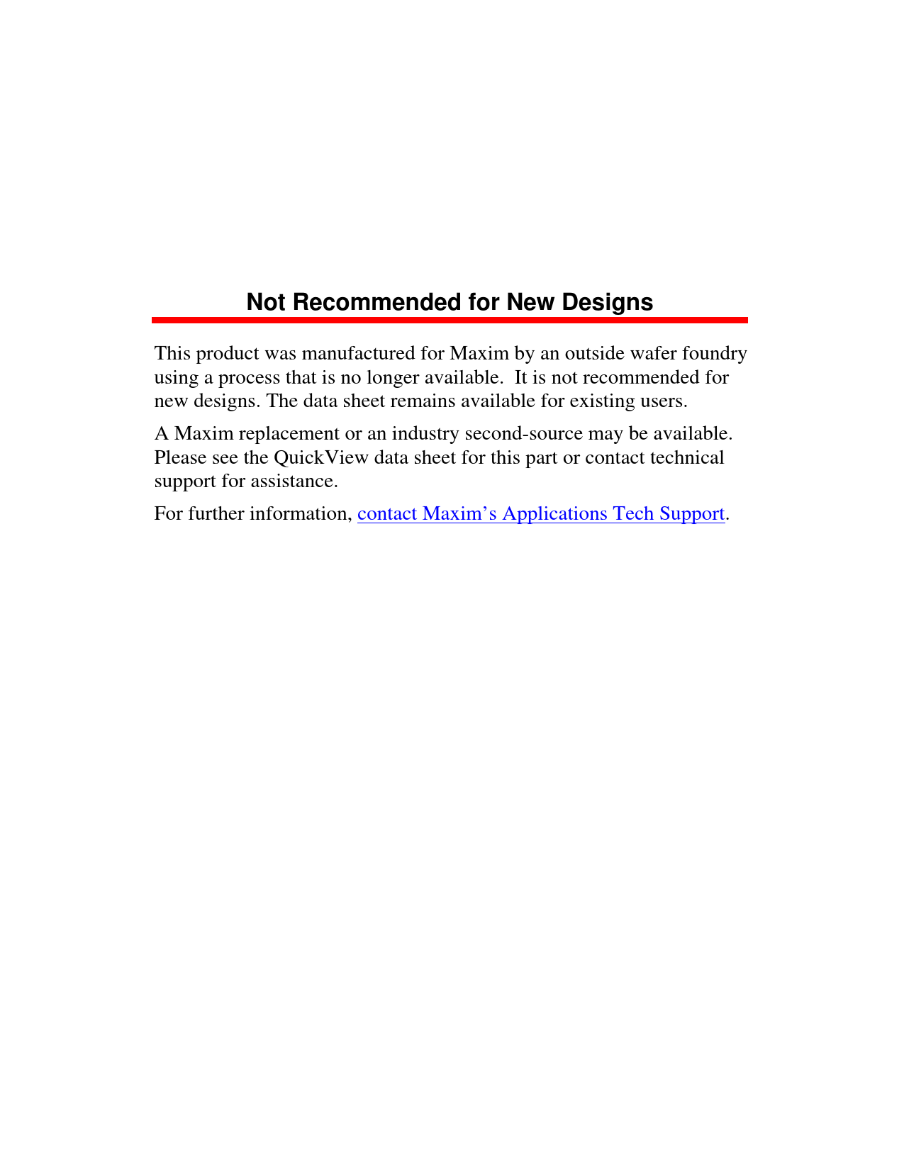 Not Recommended for New Designs This product was manufactured for Maxim by an outside wafer foundry using a process that is no longer available. It is not recommended for new designs. The data sheet remains available for existing users. A Maxim replacement or an industry second-source may be available. Please see the QuickView data sheet for this part or contact technical support for assistance. For further information, contact Maxim’s Applications Tech Support. Document Outline not-recomm-data-sheet-cover.pdf Not Recommended for New Designs