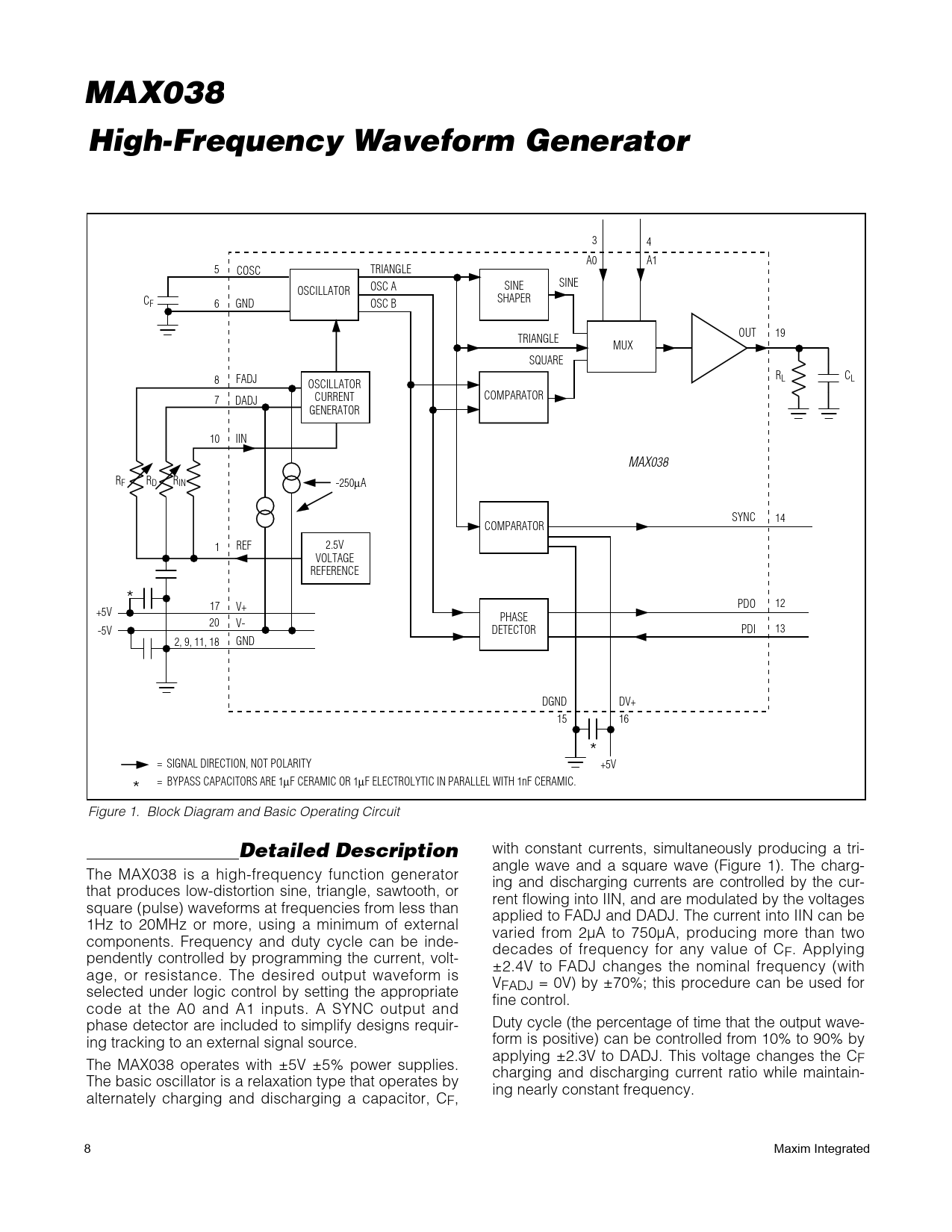 3 4 A0 A1 5 COSC TRIANGLE SINE SINE OSCILLATOR OSC A C SHAPER F 6 GND OSC B OUT 19 TRIANGLE MUX SQUARE 8 FADJ RL CL OSCILLATOR CURRENT COMPARATOR 7 DADJ GENERATOR 10 IIN MAX038 RF RD RIN -250μA SYNC 14 COMPARATOR 1 REF 2.5V VOLTAGE REFERENCE * 17 V+ PDO 12 +5V PHASE 20 V- -5V DETECTOR PDI 13 2, 9, 11, 18 GND DGND DV+ 15 16 * = SIGNAL DIRECTION, NOT POLARITY +5V = BYPASS CAPACITORS ARE 1μF CERAMIC OR 1μF ELECTROLYTIC IN PARALLEL WITH 1nF CERAMIC. * Figure 1. Block Diagram and Basic Operating Circuit