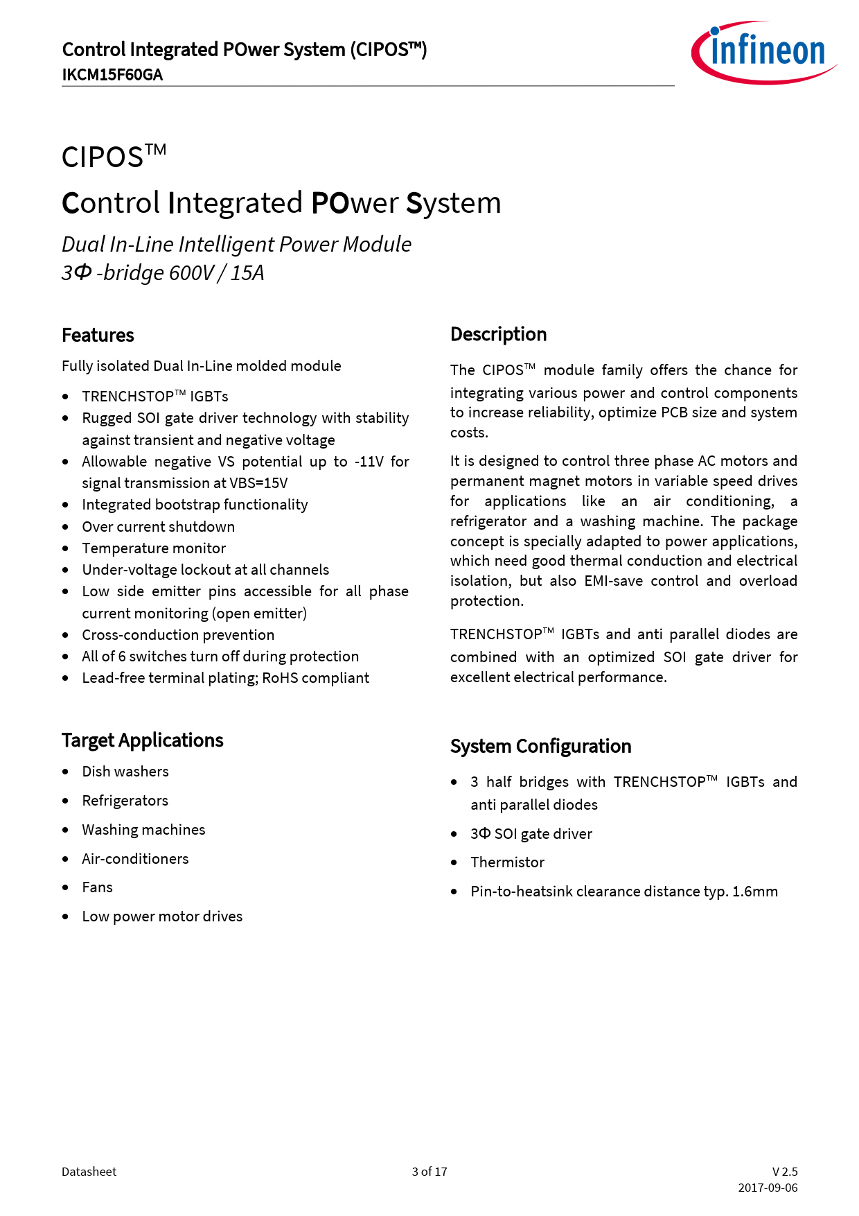 Control Integrated POwer System (CIPOS™) IKCM15F60GA CIPOS™ Control Integrated POwer System Dual In-Line Intelligent Power Module 3Φ -bridge 600V / 15A Features Description Fully isolated Dual In-Line molded module The CIPOS™ module family offers the chance for TRENCHSTOP™ IGBTs integrating various power and control components Rugged SOI gate driver technology with stability to increase reliability, optimize PCB size and system against transient and negative voltage costs. Allowable negative VS potential up to -11V for It is designed to control three phase AC motors and signal transmission at VBS=15V permanent magnet motors in variable speed drives Integrated bootstrap functionality for applications like an air conditioning, a Over current shutdown refrigerator and a washing machine. The package concept is specially adapted to power applications, Temperature monitor which need good thermal conduction and electrical Under-voltage lockout at all channels isolation, but also EMI-save control and overload Low side emitter pins accessible for all phase protection. current monitoring (open emitter) Cross-conduction prevention TRENCHSTOP™ IGBTs and anti parallel diodes are All of 6 switches turn off during protection combined with an optimized SOI gate driver for Lead-free terminal plating; RoHS compliant excellent electrical performance. Target Applications System Configuration Dish washers 3 half bridges with TRENCHSTOP™ IGBTs and Refrigerators anti parallel diodes Washing machines 3Φ SOI gate driver Air-conditioners Thermistor Fans Pin-to-heatsink clearance distance typ. 1.6mm Low power motor drives Datasheet 3 of 17 V 2.5 2017-09-06 Document Outline Table of contents CIPOS™ Control Integrated POwer System Features Target Applications Description System Configuration Pin Configuration Internal Electrical Schematic Pin Assignment Pin Description HIN(U, V, W) and LIN(U, V, W) (Low side and high side control pins, Pin 7 - 12) VFO (Fault-output and NTC, Pin 14) ITRIP (Over current detection function, Pin 15) VDD, VSS (Low side control supply and reference, Pin 13, 16) VB(U, V, W) and VS(U, V, W) (High side supplies, Pin 1 - 6) NW, NV, NU (Low side emitter, Pin 17 - 19) W, V, U (High side emitter and low side collector, Pin 20 - 22) P (Positive bus input voltage, Pin 23) Absolute Maximum Ratings Module Section Inverter Section Control Section Recommended Operation Conditions Static Parameters Dynamic Parameters Bootstrap Parameters Thermistor Mechanical Characteristics and Ratings Circuit of a Typical Application Switching Times Definition Electrical characteristic Package Outline Revision history