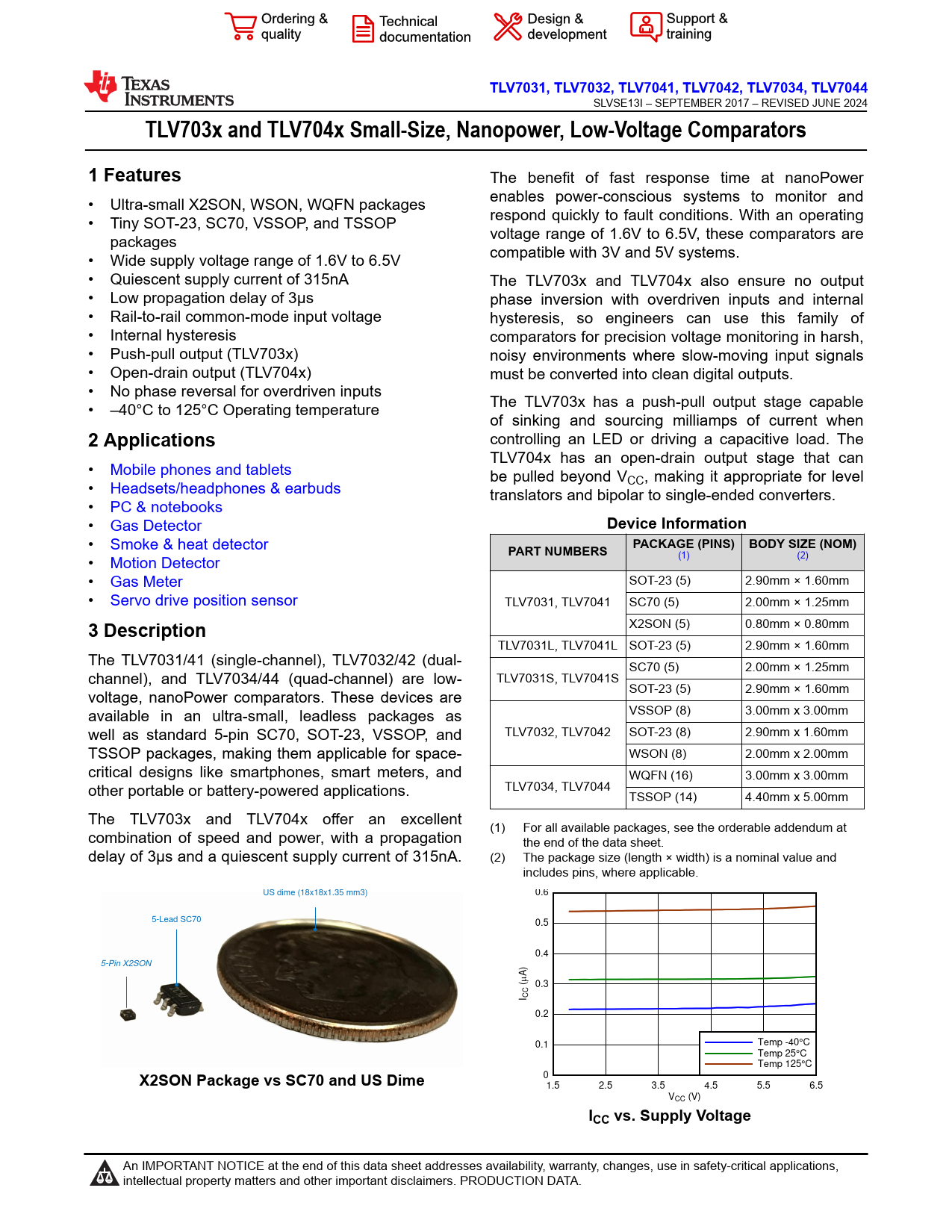 link to page 1 link to page 1 TLV7031,TLV7032,TLV7041,TLV7042,TLV7034,TLV7044 SLVSE13I – SEPTEMBER 2017 – REVISED JUNE 2024 TLV703x and TLV704x Small-Size, Nanopower, Low-Voltage Comparators1 Features The benefit of fast response time at nanoPower • Ultra-small X2SON, WSON, WQFN packages enables power-conscious systems to monitor and • Tiny SOT-23, SC70, VSSOP, and TSSOP respond quickly to fault conditions. With an operating packages voltage range of 1.6V to 6.5V, these comparators are • Wide supply voltage range of 1.6V to 6.5V compatible with 3V and 5V systems. • Quiescent supply current of 315nA The TLV703x and TLV704x also ensure no output • Low propagation delay of 3µs phase inversion with overdriven inputs and internal • Rail-to-rail common-mode input voltage hysteresis, so engineers can use this family of • Internal hysteresis comparators for precision voltage monitoring in harsh, • Push-pull output (TLV703x) noisy environments where slow-moving input signals • Open-drain output (TLV704x) must be converted into clean digital outputs. • No phase reversal for overdriven inputs • –40°C to 125°C Operating temperature The TLV703x has a push-pull output stage capable of sinking and sourcing milliamps of current when 2 Applications controlling an LED or driving a capacitive load. The TLV704x has an open-drain output stage that can • Mobile phones and tablets be pulled beyond V • Headsets/headphones & earbuds CC, making it appropriate for level translators and bipolar to single-ended converters. • PC & notebooks • Gas Detector Device Information • Smoke & heat detector PACKAGE (PINS) BODY SIZE (NOM)PART NUMBERS • Motion Detector (1) (2) • Gas Meter SOT-23 (5) 2.90mm × 1.60mm • Servo drive position sensor TLV7031, TLV7041 SC70 (5) 2.00mm × 1.25mm 3 Description X2SON (5) 0.80mm × 0.80mm TLV7031L, TLV7041L SOT-23 (5) 2.90mm × 1.60mm The TLV7031/41 (single-channel), TLV7032/42 (dual- SC70 (5) 2.00mm × 1.25mm channel), and TLV7034/44 (quad-channel) are low- TLV7031S, TLV7041S SOT-23 (5) 2.90mm × 1.60mm voltage, nanoPower comparators. These devices are available in an ultra-small, leadless packages as VSSOP (8) 3.00mm x 3.00mm well as standard 5-pin SC70, SOT-23, VSSOP, and TLV7032, TLV7042 SOT-23 (8) 2.90mm x 1.60mm TSSOP packages, making them applicable for space- WSON (8) 2.00mm x 2.00mm critical designs like smartphones, smart meters, and WQFN (16) 3.00mm x 3.00mm other portable or battery-powered applications. TLV7034, TLV7044 TSSOP (14) 4.40mm x 5.00mm The TLV703x and TLV704x offer an excellent (1) For all available packages, see the orderable addendum at combination of speed and power, with a propagation the end of the data sheet. delay of 3μs and a quiescent supply current of 315nA. (2) The package size (length × width) is a nominal value and includes pins, where applicable. US dime (18x18x1.35 mm3) 0.6 5-Lead SC70 0.5 0.4 5-Pin X2SON ) A (P 0.3 CIC 0.2 0.1 Temp -40°C Temp 25°C Temp 125°C X2SON Package vs SC70 and US Dime 0 1.5 2.5 3.5 4.5 5.5 6.5 VCC (V) ICC vs. Supply Voltage An IMPORTANT NOTICE at the end of this data sheet addresses availability, warranty, changes, use in safety-critical applications, intellectual property matters and other important disclaimers. PRODUCTION DATA. Document Outline 1 Features 2 Applications 3 Description Table of Contents 4 Pin Configuration and Functions Pin Functions Pin Functions: TLV7032/42 Pin Functions: TLV7034/44 5 Specifications 5.1 Absolute Maximum Ratings 5.2 ESD Ratings 5.3 Recommended Operating Conditions 5.4 Thermal Information (Single) 5.5 Thermal Information (Dual) 5.6 Thermal Information (Quad) 5.7 Electrical Characteristics (Single) 5.8 Switching Characteristics (Single) 5.9 Electrical Characteristics (Dual) 5.10 Switching Characteristics (Dual) 5.11 Electrical Characteristics (Quad) 5.12 Switching Characteristics (Quad) 5.13 Timing Diagrams 5.14 Typical Characteristics 6 Detailed Description 6.1 Overview 6.2 Functional Block Diagram 6.3 Feature Description 6.4 Device Functional Modes 6.4.1 Inputs 6.4.2 Internal Hysteresis 6.4.3 Output 7 Application and Implementation 7.1 Application Information 7.1.1 Inverting Comparator With Hysteresis for TLV703x 7.1.2 Noninverting Comparator With Hysteresis for TLV703x 7.2 Typical Applications 7.2.1 Window Comparator 7.2.1.1 Design Requirements 7.2.1.2 Detailed Design Procedure 7.2.1.3 Application Curve 7.2.2 IR Receiver Analog Front End 7.2.2.1 Design Requirements 7.2.2.2 Detailed Design Procedure 7.2.2.3 Application Curve 7.2.3 Square-Wave Oscillator 7.2.3.1 Design Requirements 7.2.3.2 Detailed Design Procedure 7.2.3.3 Application Curve 7.2.4 Quadrature Rotary Encoder 7.2.4.1 Design Requirements 7.2.4.2 Detailed Design Procedure 7.2.4.3 Application Curve 7.3 Power Supply Recommendations 7.4 Layout 7.4.1 Layout Guidelines 7.4.2 Layout Example 8 Device and Documentation Support 8.1 Device Support 8.1.1 Development Support 8.1.1.1 Evaluation Module 8.2 Documentation Support 8.2.1 Related Documentation 8.3 Receiving Notification of Documentation Updates 8.4 Support Resources 8.5 Trademarks 8.6 Electrostatic Discharge Caution 8.7 Glossary 9 Revision History 10 Mechanical, Packaging, and Orderable Information