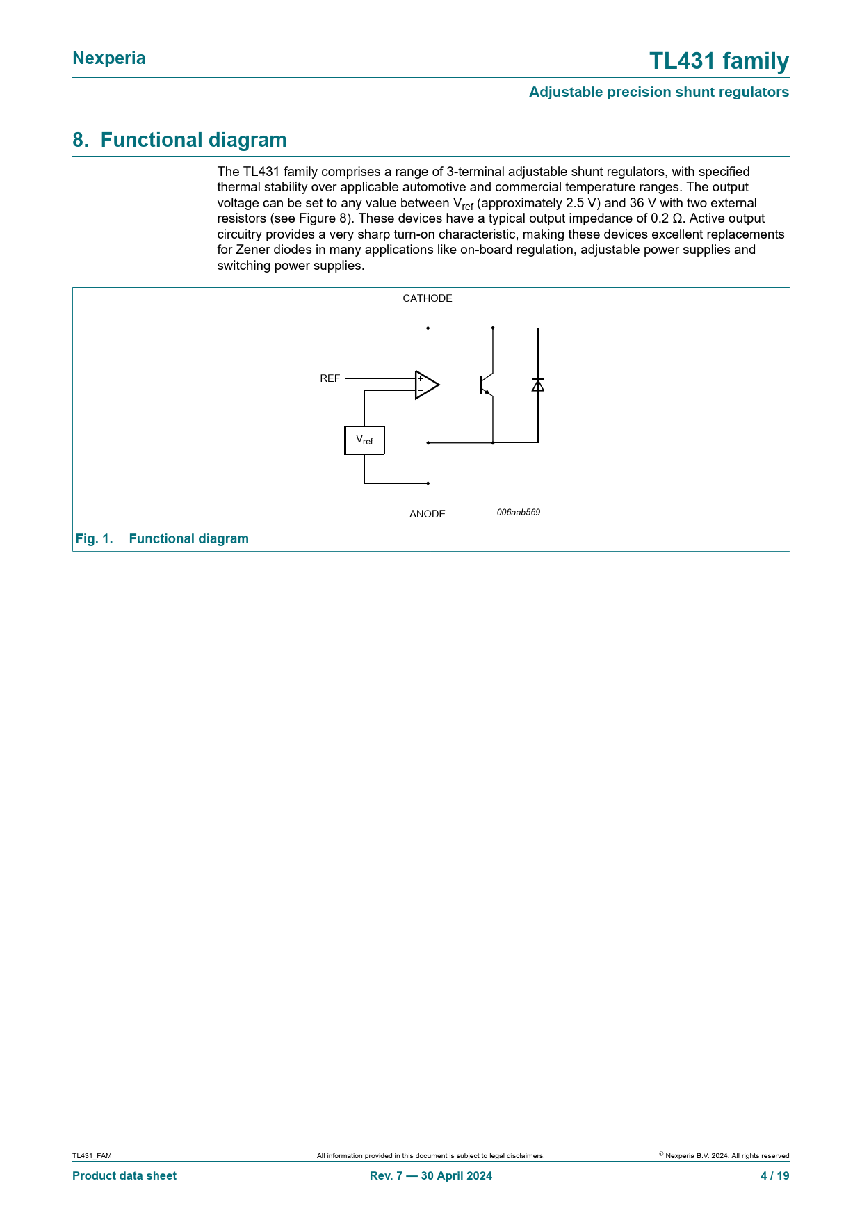 Nexperia. TL431 family. Adjustable precision shunt regulators. 8. Functional diagram. Fig. 1. Functional diagram