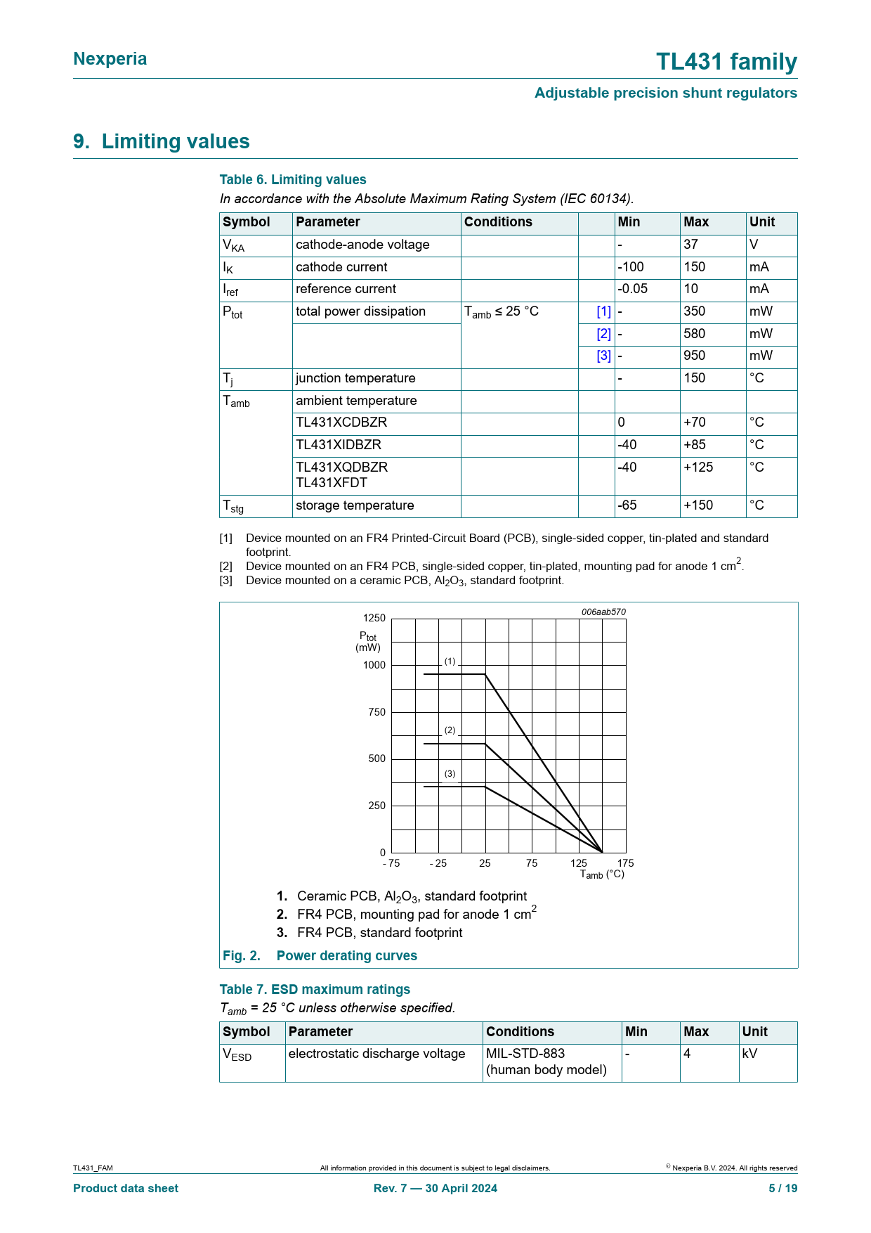 VESD electrostatic discharge voltage MIL-STD-883 - 4 kV (human body model) TL431_FAM All information provided in this document is subject to legal disclaimers. © Nexperia B.V. 2024. Al rights reserved