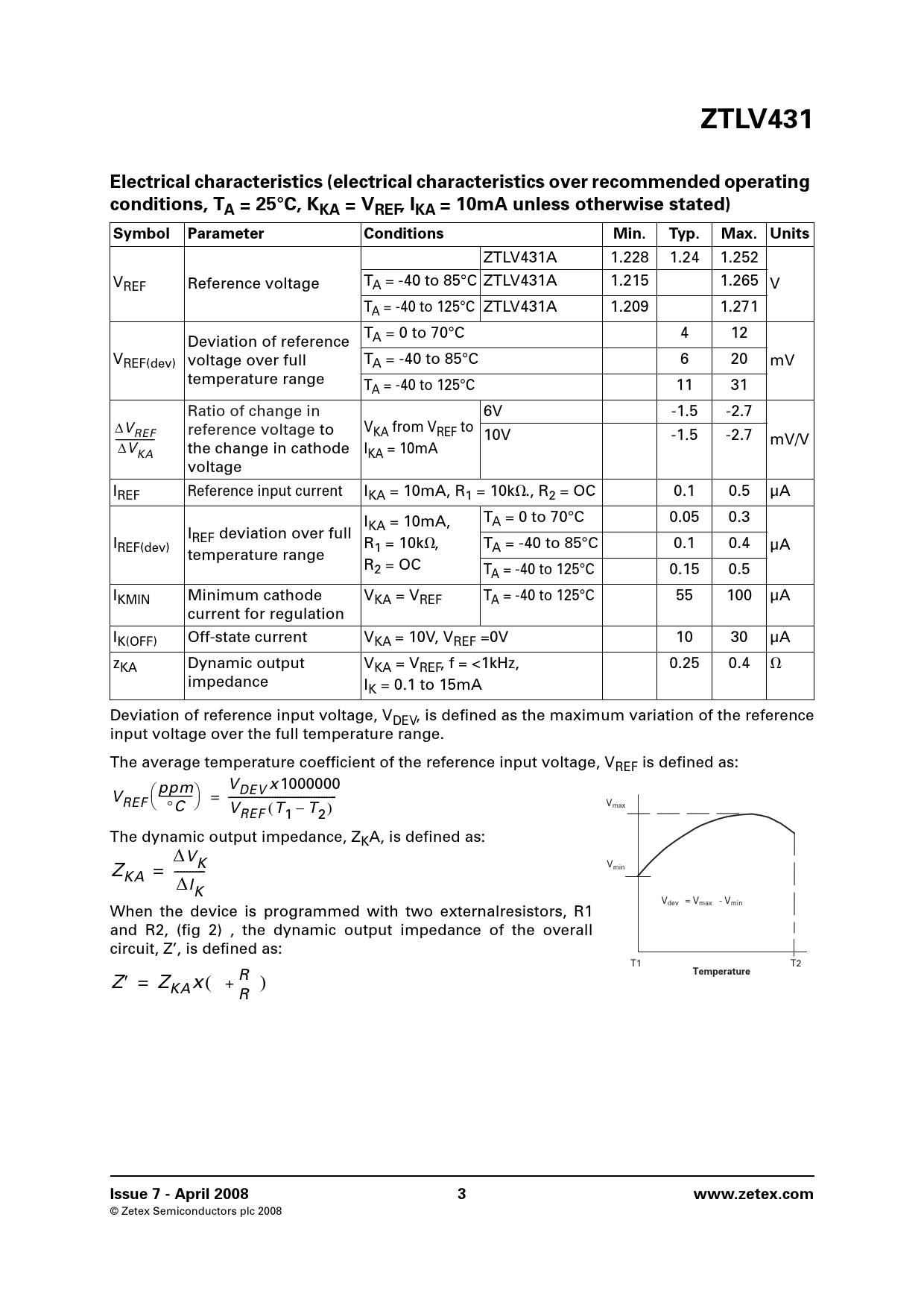 ZTLV431A 1.228 1.24 1.252 V T REF Reference voltage A = -40 to 85°C ZTLV431A 1.215 1.265 V TA = -40 to 125°C ZTLV431A 1.209 1.271 T Deviation of reference A = 0 to 70°C 4 12 VREF(dev) voltage over full TA = -40 to 85°C 6 20 mV temperature range TA = -40 to 125°C 11 31 Ratio of change in 6V -1.5 -2.7 ΔVREF reference voltage to VKA from VREF to 10V -1.5 -2.7 --------- mV/V ΔV the change in cathode I KA KA = 10mA voltage IREF Reference input current IKA = 10mA, R1 = 10k⍀., R2 = OC 0.1 0.5 µA I T KA = 10mA, A = 0 to 70°C 0.05 0.3 I I REF deviation over full REF(dev) R1 = 10k⍀, TA = -40 to 85°C 0.1 0.4 µA temperature range R2 = OC TA = -40 to 125°C 0.15 0.5 IKMIN Minimum cathode VKA = VREF TA = -40 to 125°C 55 100 µA current for regulation IK(OFF) Off-state current VKA = 10V, VREF =0V 10 30 µA zKA Dynamic output VKA = VREF, f = <1kHz, 0.25 0.4 ⍀ impedance IK = 0.1 to 15mA Deviation of reference input voltage, VDEV, is defined as the maximum variation of the reference input voltage over the full temperature range. The average temperature coefficient of the reference input voltage, VREF is defined as: ⎛ppm⎞ V x 1000000 V ------- DEV = --------------------- REF Vmax ⎝ °C ⎠ V (T – T ) REF 1 2 The dynamic output impedance, ZKA, is defined as: ΔVK Vmin ZKA = Δ-----IK Vdev = Vmax - Vmin When the device is programmed with two externalresistors, R1 and R2, (fig 2) , the dynamic output impedance of the overall circuit, Z’, is defined as: T1 T2