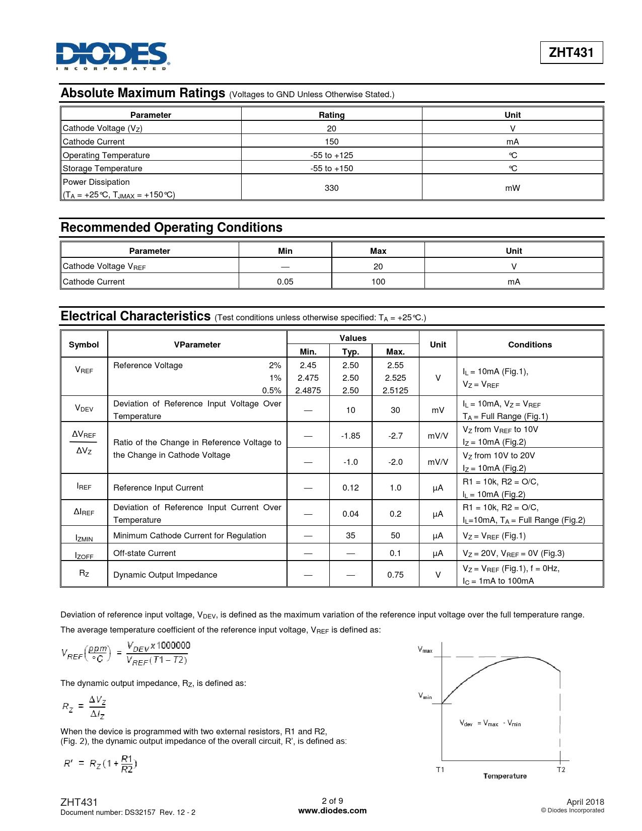Reference Voltage 2% 2.45 2.50 2.55 VREF IL = 10mA (Fig.1), 1% 2.475 2.50 2.525 V VZ = VREF 0.5% 2.4875 2.50 2.5125 Deviation of Reference Input Voltage Over I V L = 10mA, VZ = VREF DEV — 10 30 mV Temperature TA = Full Range (Fig.1) ΔV VZ from VREF to 10V REF — -1.85 -2.7 mV/V Ratio of the Change in Reference Voltage to IZ = 10mA (Fig.2) ΔVZ the Change in Cathode Voltage V — Z from 10V to 20V -1.0 -2.0 mV/V IZ = 10mA (Fig.2) R1 = 10k, R2 = O/C, IREF Reference Input Current — 0.12 1.0 µA lL = 10mA (Fig.2) ΔI Deviation of Reference Input Current Over R1 = 10k, R2 = O/C, REF — 0.04 0.2 µA Temperature IL=10mA, TA = Full Range (Fig.2) IZMIN Minimum Cathode Current for Regulation — 35 50 µA VZ = VREF (Fig.1) IZOFF Off-state Current — — 0.1 µA VZ = 20V, VREF = 0V (Fig.3) V R Z = VREF (Fig.1), f = 0Hz, Z Dynamic Output Impedance — — 0.75 V IC = 1mA to 100mA Deviation of reference input voltage, VDEV, is defined as the maximum variation of the reference input voltage over the full temperature range. The average temperature coefficient of the reference input voltage, VREF is defined as: The dynamic output impedance, RZ, is defined as: When the device is programmed with two external resistors, R1 and R2, (Fig. 2), the dynamic output impedance of the overall circuit, R’, is defined as: ZHT431 2 of 9 April 2018 Document number: DS32157 Rev. 12 - 2
