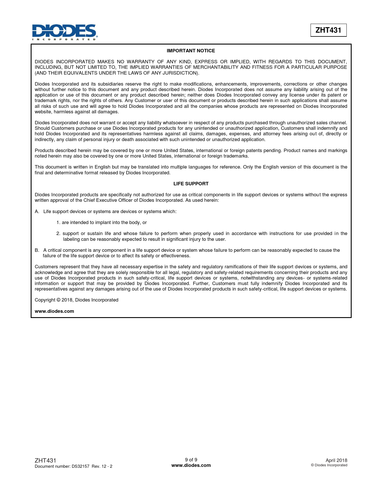 | Seiten / Seite | 9 / 9 — ZHT431. IMPORTANT NOTICE. LIFE SUPPORT. www.diodes.com |