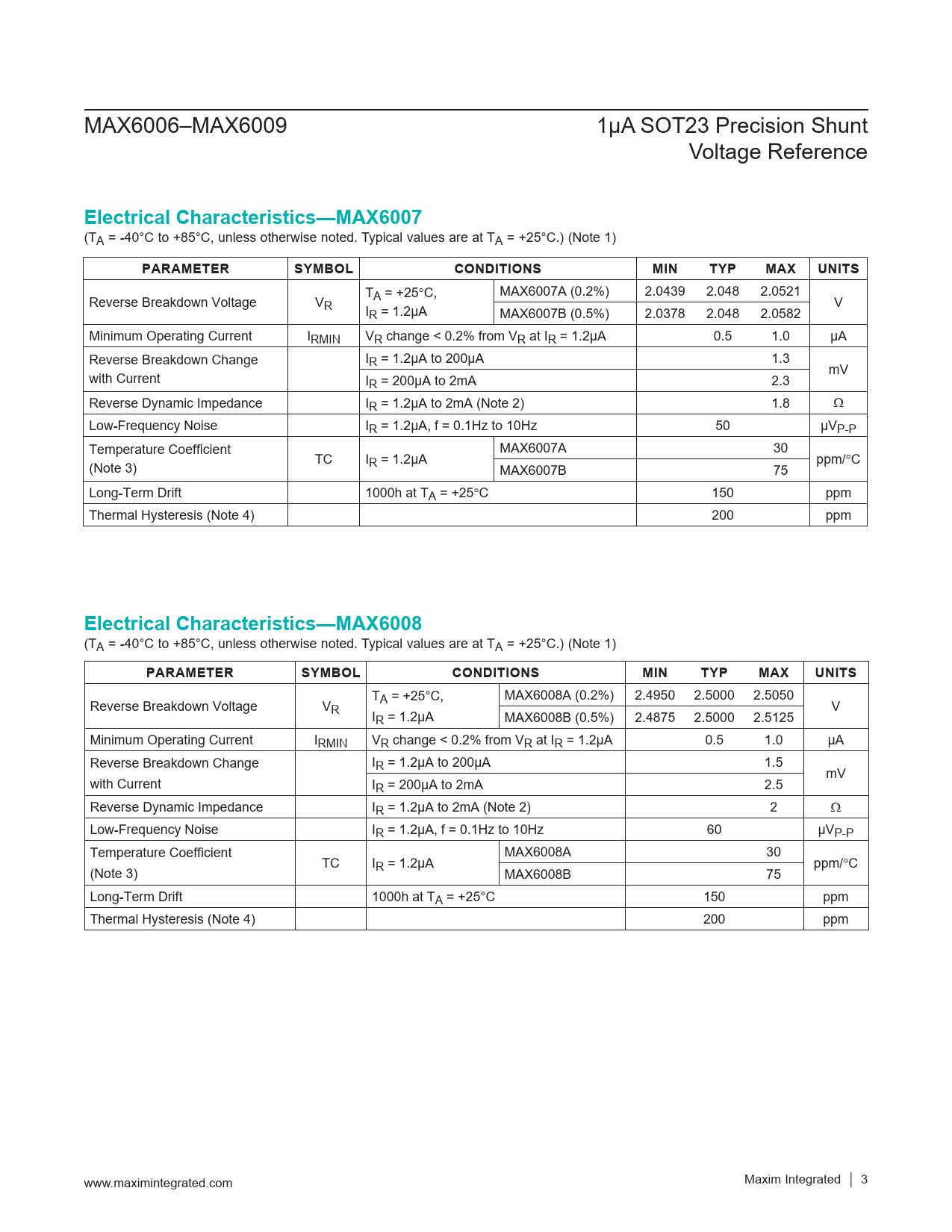 T MAX6007A (0.2%) 2.0439 2.048 2.0521 Reverse Breakdown Voltage V A = +25°C, R V IR = 1.2µA MAX6007B (0.5%) 2.0378 2.048 2.0582 Minimum Operating Current IRMIN VR change < 0.2% from VR at IR = 1.2µA 0.5 1.0 µA Reverse Breakdown Change IR = 1.2µA to 200µA 1.3 mV with Current IR = 200µA to 2mA 2.3 Reverse Dynamic Impedance IR = 1.2µA to 2mA (Note 2) 1.8 W Low-Frequency Noise IR = 1.2µA, f = 0.1Hz to 10Hz 50 µVP-P Temperature Coefficient MAX6007A 30 TC I ppm/°C (Note 3) R = 1.2µA MAX6007B 75 Long-Term Drift 1000h at TA = +25°C 150 ppm Thermal Hysteresis (Note 4) 200 ppm