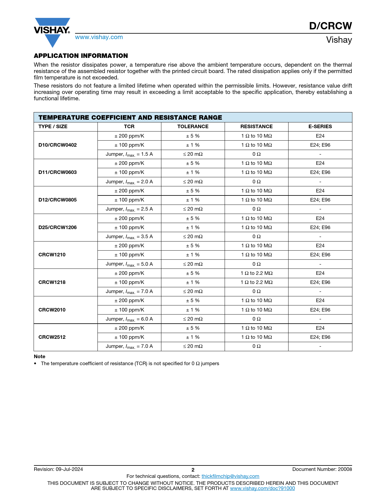 D/CRCW www.vishay.com Vishay APPLICATION INFORMATION When the resistor dissipates power, a temperature rise above the ambient temperature occurs, dependent on the thermal resistance of the assembled resistor together with the printed circuit board. The rated dissipation applies only if the permitted film temperature is not exceeded. These resistors do not feature a limited lifetime when operated within the permissible limits. However, resistance value drift increasing over operating time may result in exceeding a limit acceptable to the specific application, thereby establishing a functional lifetime. TEMPERATURE COEFFICIENT AND RESISTANCE RANGE TYPE / SIZETCRTOLERANCERESISTANCEE-SERIES ± 200 ppm/K ± 5 % 1 Ω to 10 MΩ E24 D10/CRCW0402 ± 100 ppm/K ± 1 % 1 Ω to 10 MΩ E24; E96 Jumper, Imax. = 1.5 A ≤ 20 mΩ 0 Ω - ± 200 ppm/K ± 5 % 1 Ω to 10 MΩ E24 D11/CRCW0603 ± 100 ppm/K ± 1 % 1 Ω to 10 MΩ E24; E96 Jumper, Imax. = 2.0 A ≤ 20 mΩ 0 Ω - ± 200 ppm/K ± 5 % 1 Ω to 10 MΩ E24 D12/CRCW0805 ± 100 ppm/K ± 1 % 1 Ω to 10 MΩ E24; E96 Jumper, Imax. = 2.5 A ≤ 20 mΩ 0 Ω - ± 200 ppm/K ± 5 % 1 Ω to 10 MΩ E24 D25/CRCW1206 ± 100 ppm/K ± 1 % 1 Ω to 10 MΩ E24; E96 Jumper, Imax. = 3.5 A ≤ 20 mΩ 0 Ω - ± 200 ppm/K ± 5 % 1 Ω to 10 MΩ E24 CRCW1210 ± 100 ppm/K ± 1 % 1 Ω to 10 MΩ E24; E96 Jumper, Imax. = 5.0 A ≤ 20 mΩ 0 Ω - ± 200 ppm/K ± 5 % 1 Ω to 2.2 MΩ E24 CRCW1218 ± 100 ppm/K ± 1 % 1 Ω to 2.2 MΩ E24; E96 Jumper, Imax. = 7.0 A ≤ 20 mΩ 0 Ω - ± 200 ppm/K ± 5 % 1 Ω to 10 MΩ E24 CRCW2010 ± 100 ppm/K ± 1 % 1 Ω to 10 MΩ E24; E96 Jumper, Imax. = 6.0 A ≤ 20 mΩ 0 Ω - ± 200 ppm/K ± 5 % 1 Ω to 10 MΩ E24 CRCW2512 ± 100 ppm/K ± 1 % 1 Ω to 10 MΩ E24; E96 Jumper, Imax. = 7.0 A ≤ 20 mΩ 0 Ω - Note • The temperature coefficient of resistance (TCR) is not specified for 0 Ω jumpers Revision: 09-Jul-2024 2 Document Number: 20008 For technical questions, contact: thickfilmchip@vishay.com THIS DOCUMENT IS SUBJECT TO CHANGE WITHOUT NOTICE. THE PRODUCTS DESCRIBED HEREIN AND THIS DOCUMENT ARE SUBJECT TO SPECIFIC DISCLAIMERS, SET FORTH AT www.vishay.com/doc?91000