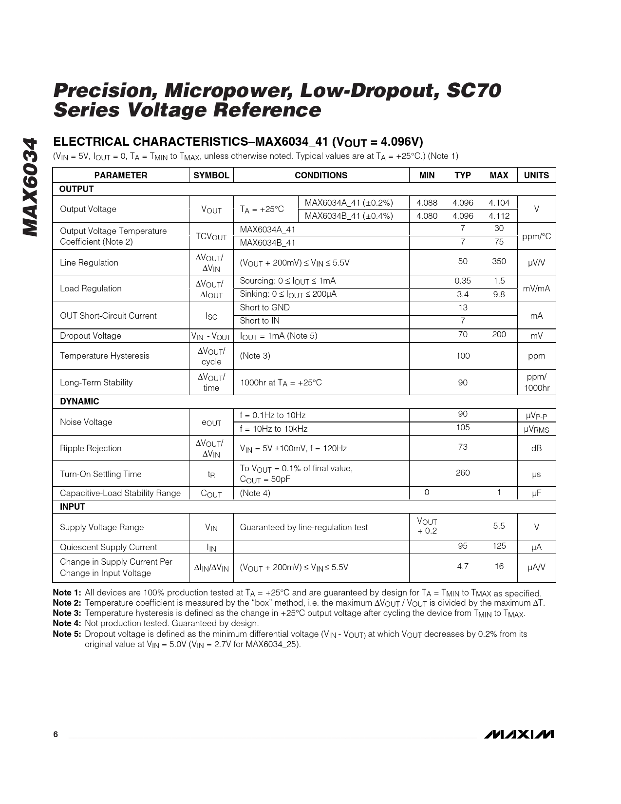 Precision, Micropower, Low-Dropout, SC70 Series Voltage ReferenceELECTRICAL CHARACTERISTICS–MAX6034_41 (VOUT = 4.096V) (VIN = 5V, IOUT = 0, TA = TMIN to TMAX, unless otherwise noted. Typical values are at TA = +25°C.) (Note 1) PARAMETERSYMBOLCONDITIONSMINTYPMAXUNITSOUTPUT MAX6034A_41 (±0.2%) 4.088 4.096 4.104 Output Voltage VOUT TA = +25°C V MAX6034B_41 (±0.4%) 4.080 4.096 4.112 MAX6034 MAX6034A_41 7 30 Output Voltage Temperature TCVOUT ppm/°C Coefficient (Note 2) MAX6034B_41 7 75 ∆VOUT/ Line Regulation ∆ (V V OUT + 200mV) ≤ VIN ≤ 5.5V 50 350 µV/V IN Sourcing: 0 ≤ IOUT ≤ 1mA 0.35 1.5 ∆V Load Regulation OUT/ ∆ mV/mA IOUT Sinking: 0 ≤ IOUT ≤ 200µA 3.4 9.8 Short to GND 13 OUT Short-Circuit Current ISC mA Short to IN 7 Dropout Voltage V IN - V OU T IOUT = 1mA (Note 5) 70 200 mV ∆V Temperature Hysteresis OUT/ (Note 3) 100 ppm cycle ∆VOUT/ ppm/ Long-Term Stability 1000hr at TA = +25°C 90 time 1000hr DYNAMIC f = 0.1Hz to 10Hz 90 µVP-P Noise Voltage eOUT f = 10Hz to 10kHz 105 µVRMS ∆VOUT/ Ripple Rejection ∆ V V IN = 5V ±100mV, f = 120Hz 73 dB IN To VOUT = 0.1% of final value, Turn-On Settling Time tR 260 µs COUT = 50pF Capacitive-Load Stability Range COUT (Note 4) 0 1 µF INPUT VOUT Supply Voltage Range VIN Guaranteed by line-regulation test 5.5 + 0.2 V Quiescent Supply Current IIN 95 125 µA Change in Supply Current Per ∆IIN/∆VIN (VOUT + 200mV) ≤ VIN ≤ 5.5V 4.7 16 µA/V Change in Input Voltage Note 1: All devices are 100% production tested at TA = +25°C and are guaranteed by design for TA = TMIN to TMAX as specified. Note 2: Temperature coefficient is measured by the “box” method, i.e. the maximum ∆VOUT / VOUT is divided by the maximum ∆T. Note 3: Temperature hysteresis is defined as the change in +25°C output voltage after cycling the device from TMIN to TMAX. Note 4: Not production tested. Guaranteed by design. Note 5: Dropout voltage is defined as the minimum differential voltage (VIN - VOUT) at which VOUT decreases by 0.2% from its original value at VIN = 5.0V (VIN = 2.7V for MAX6034_25). 6_______________________________________________________________________________________